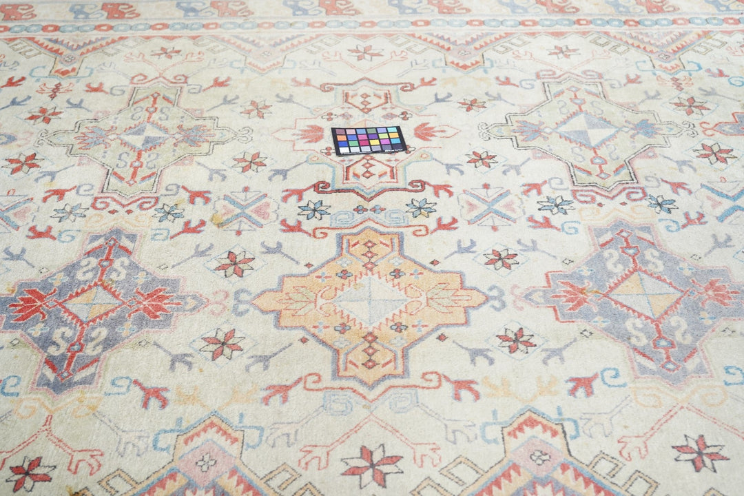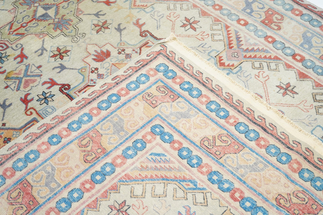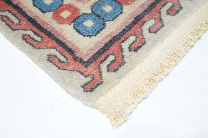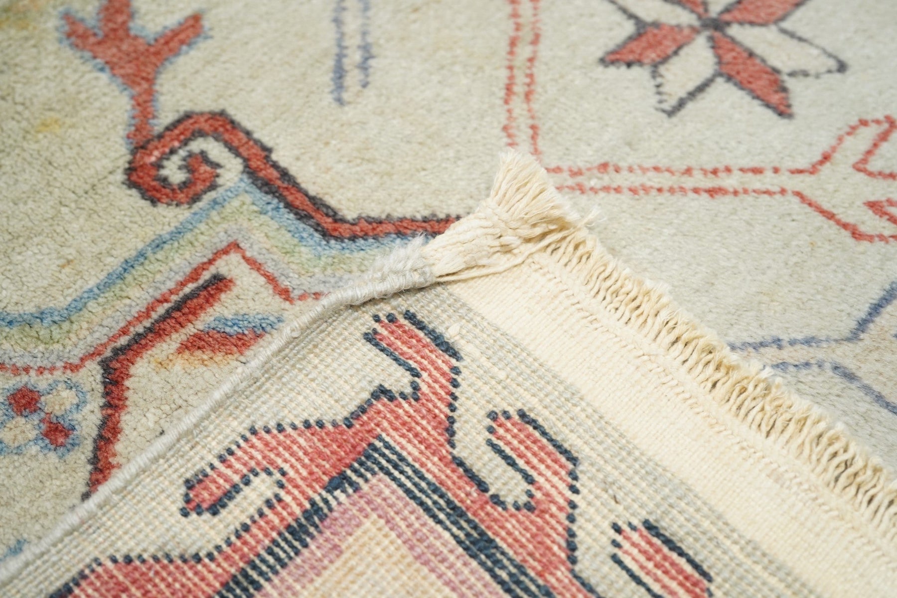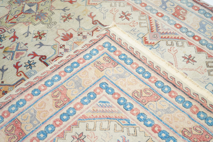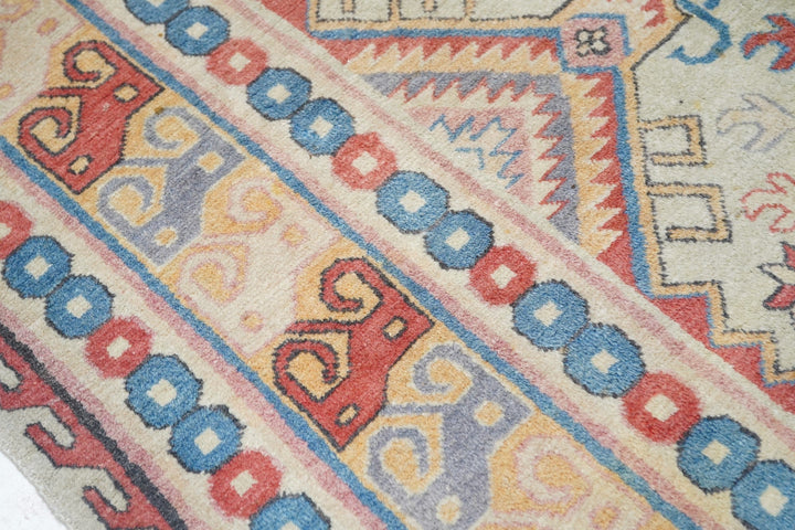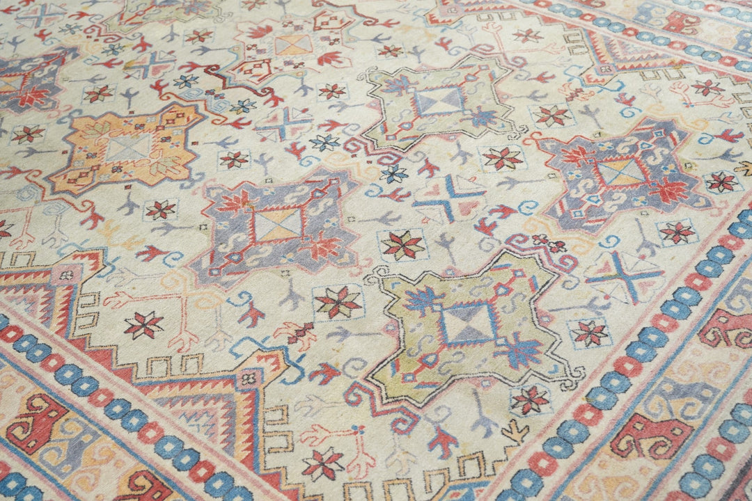 The light straw field show two columns, each of five variously colored, laterally extended, octogramme medallions, all sprouting thin floral extensions, with rainbow striped, nested lateral columns of triangles. Straw main border with red, cream and light blue details. Cotton foundation, medium weave. Versatile size. East Turkestan Xinjiang Province oasis town carpet.