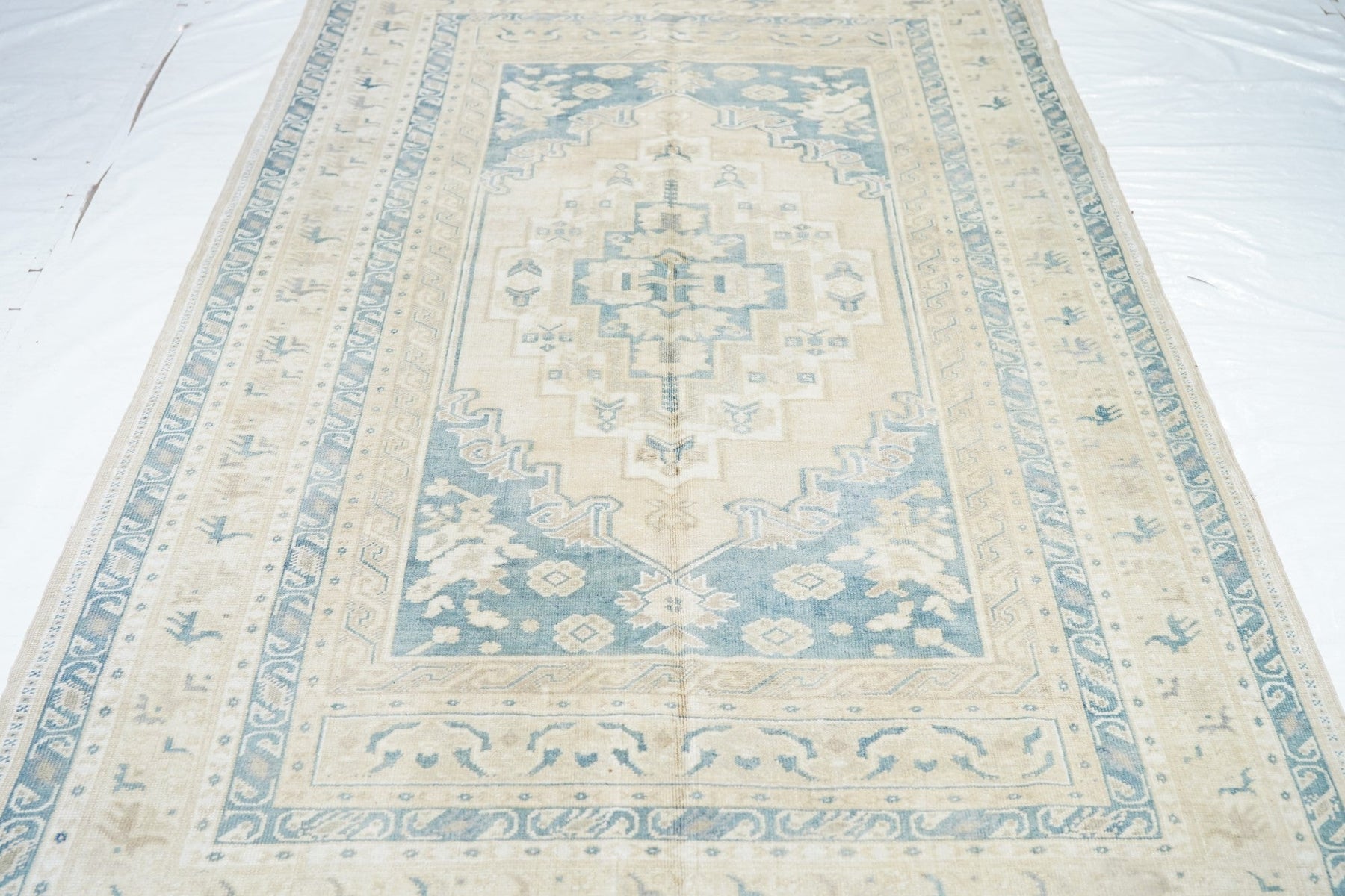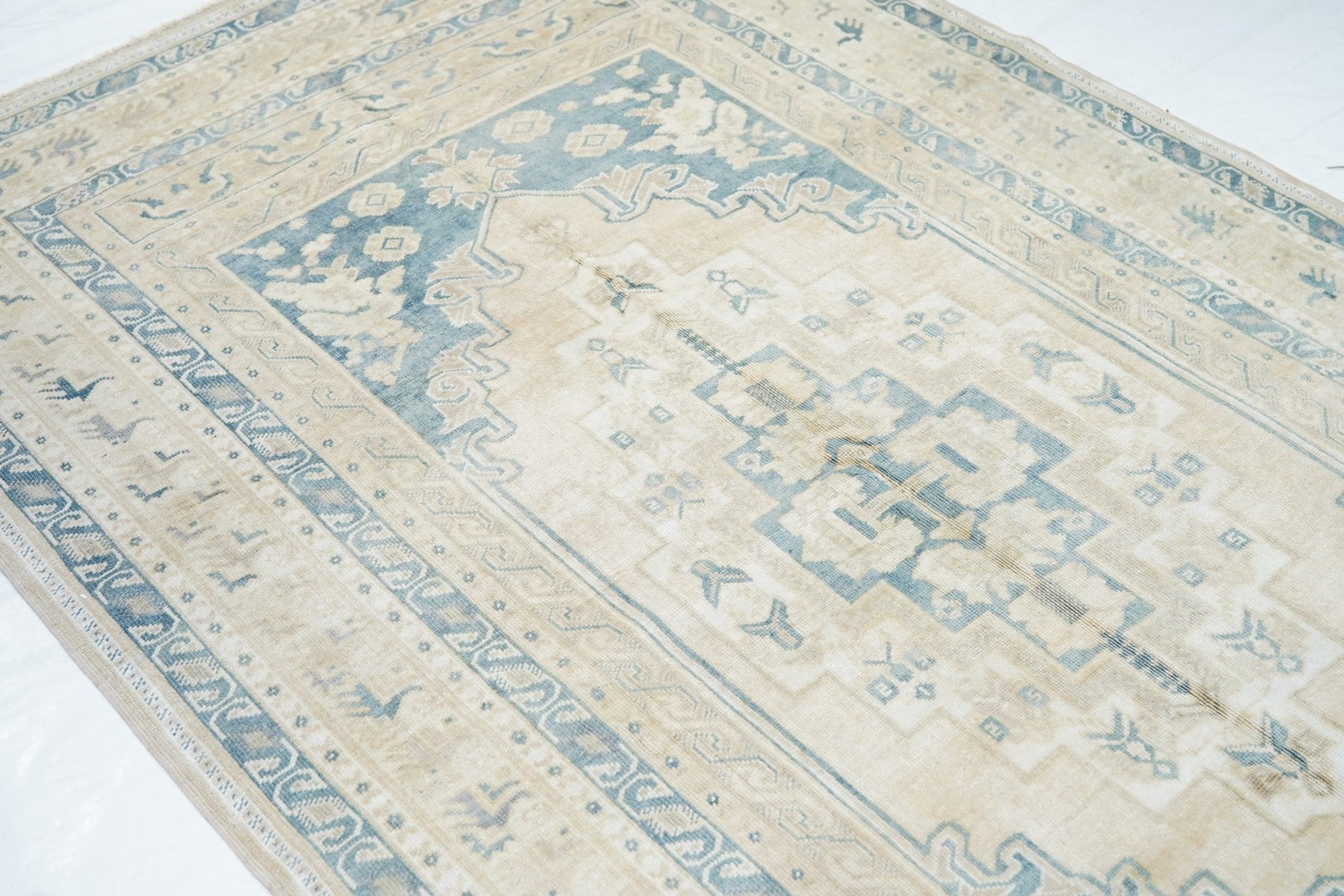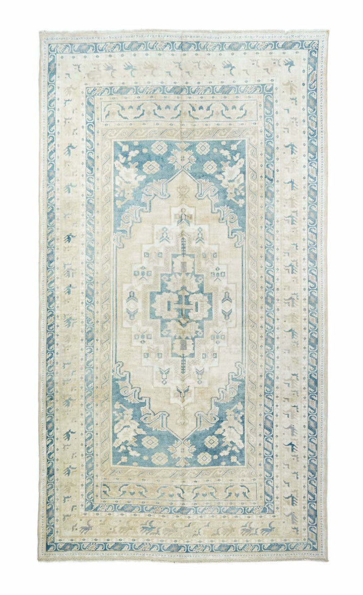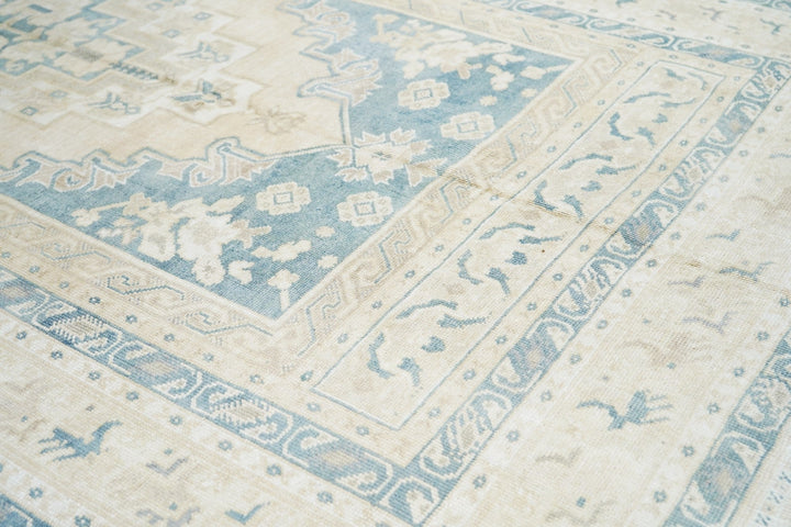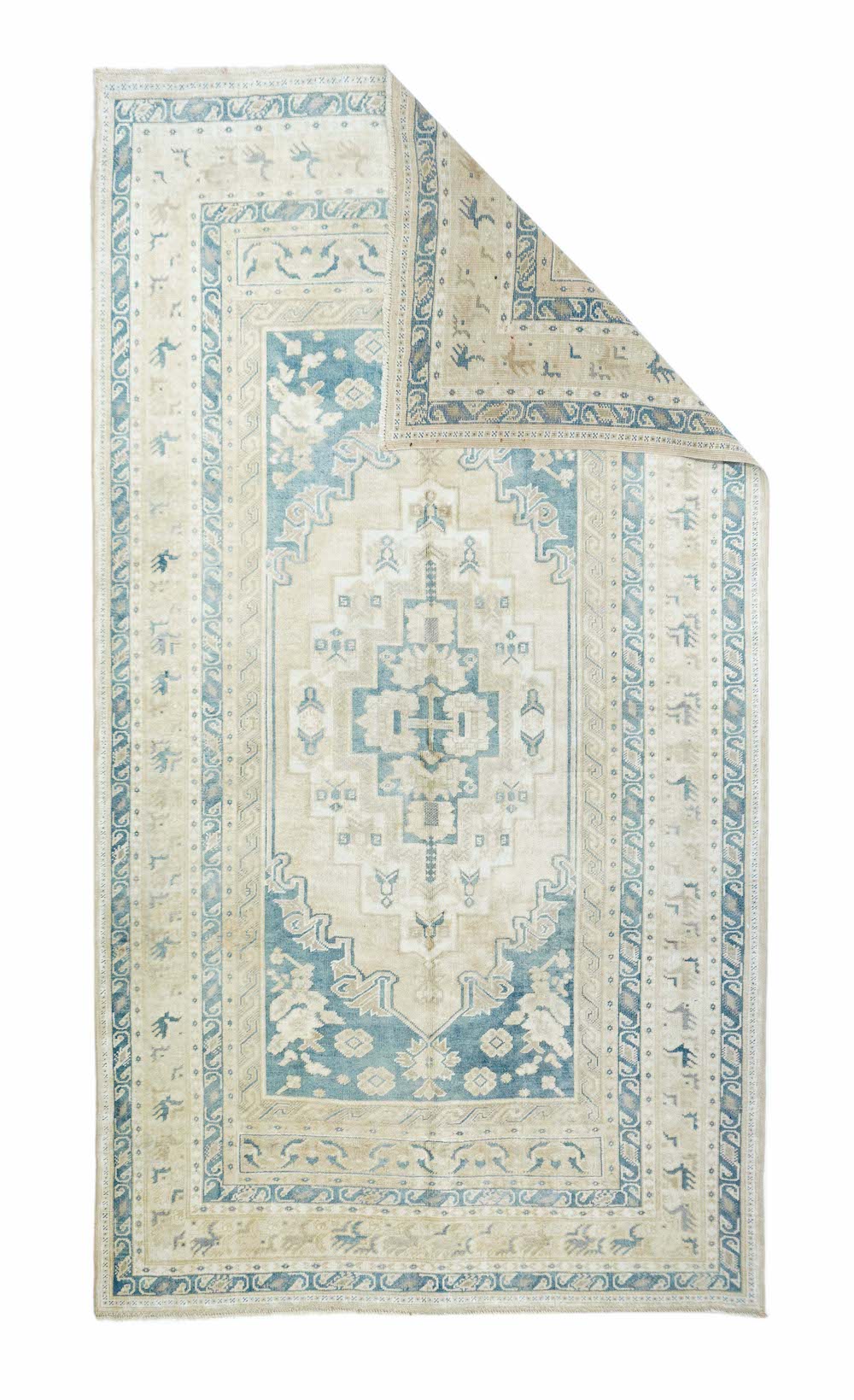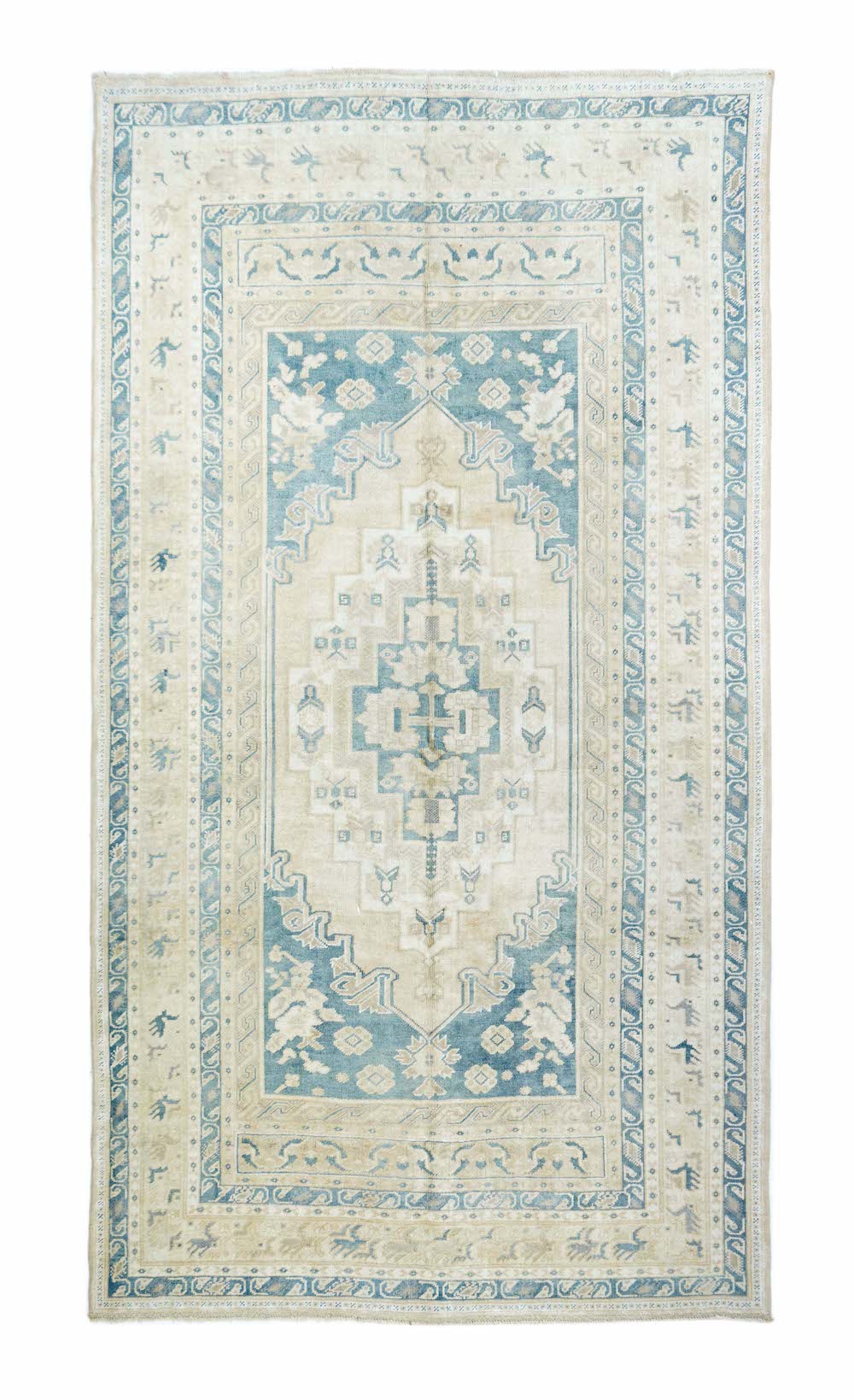 The slate field expands to corner spandrels separated by single palmettes. The straw sub-field shows a sand stepped medallion and an inner slate six-palmette sub-medallion. Main border in the Bergama style with slanted, fringed palmettes. Vintage. Moderate weave. Good condition.