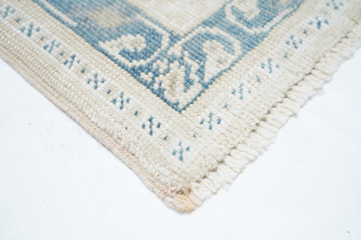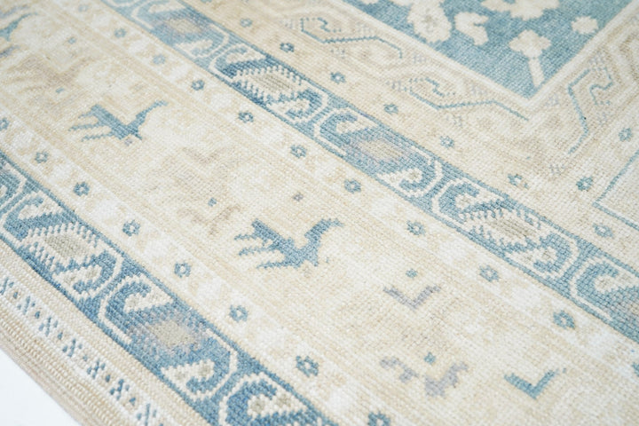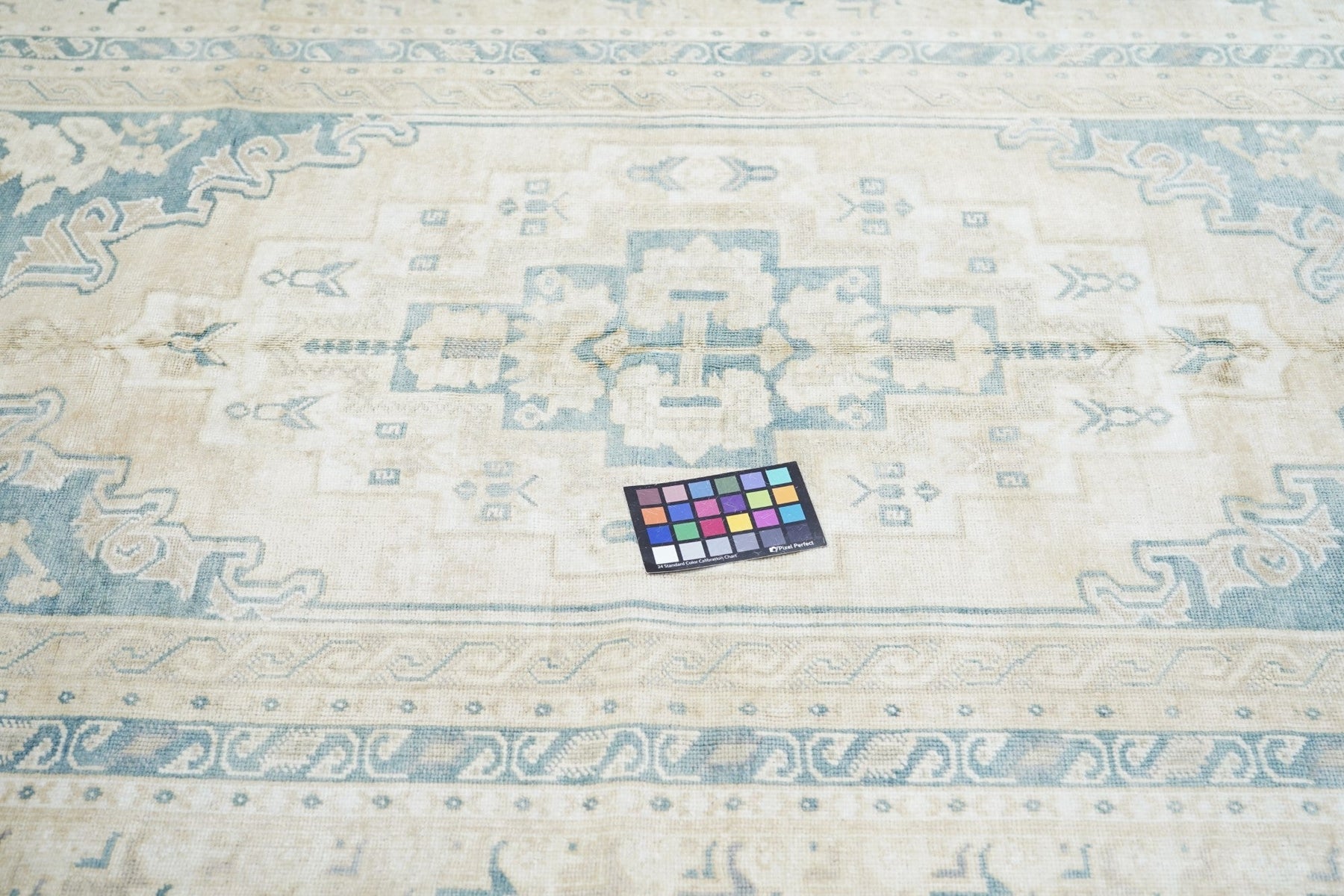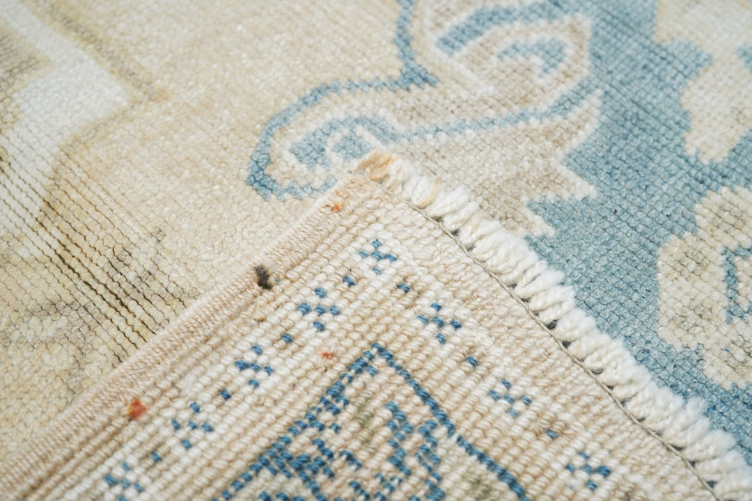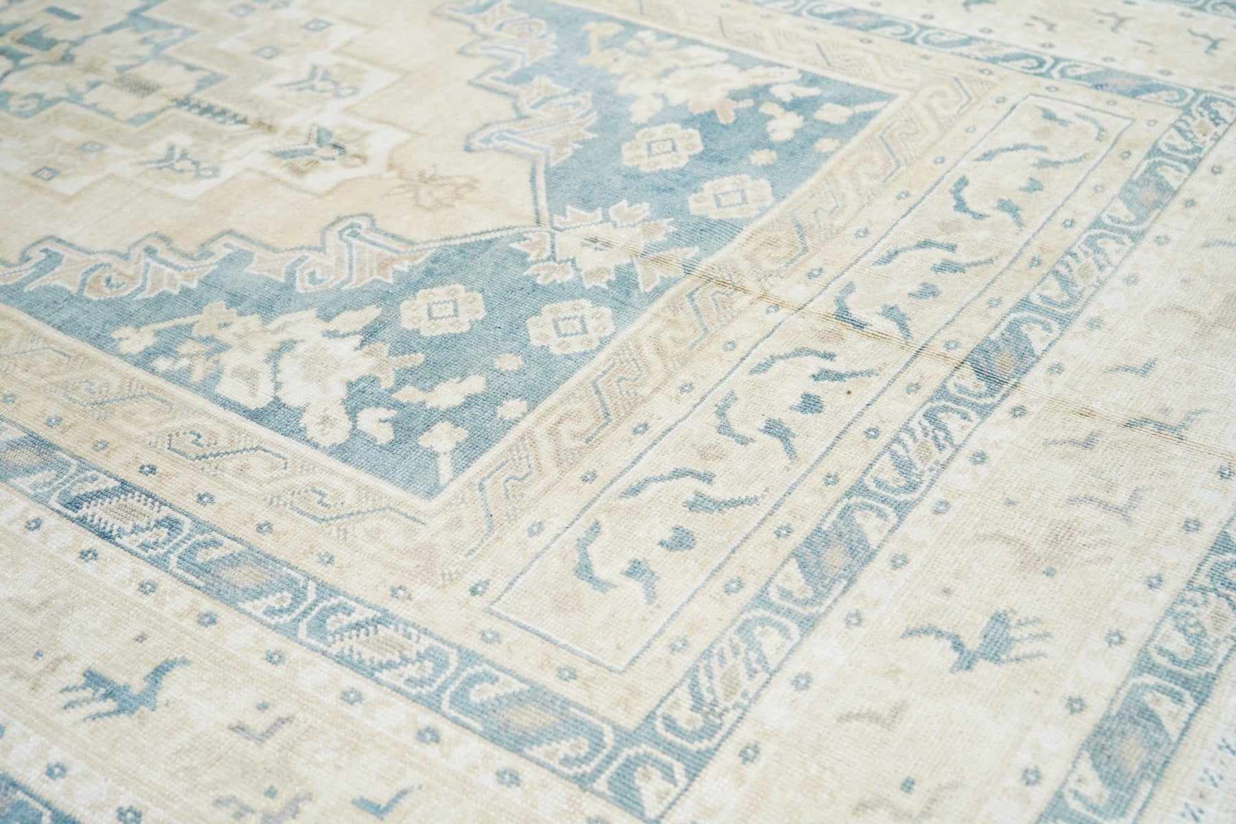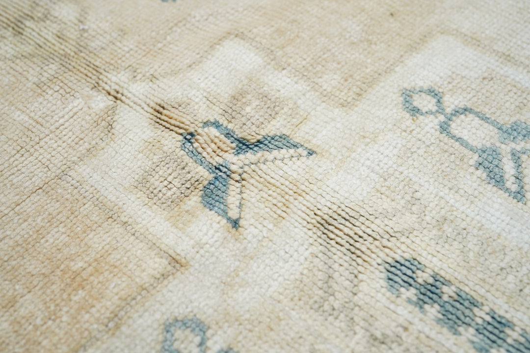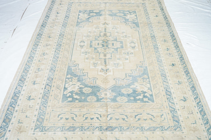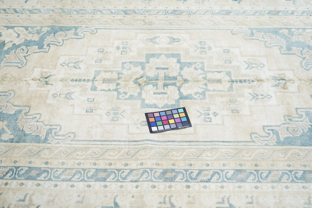 The slate field expands to corner spandrels separated by single palmettes. The straw sub-field shows a sand stepped medallion and an inner slate six-palmette sub-medallion. Main border in the Bergama style with slanted, fringed palmettes. Vintage. Moderate weave. Good condition.