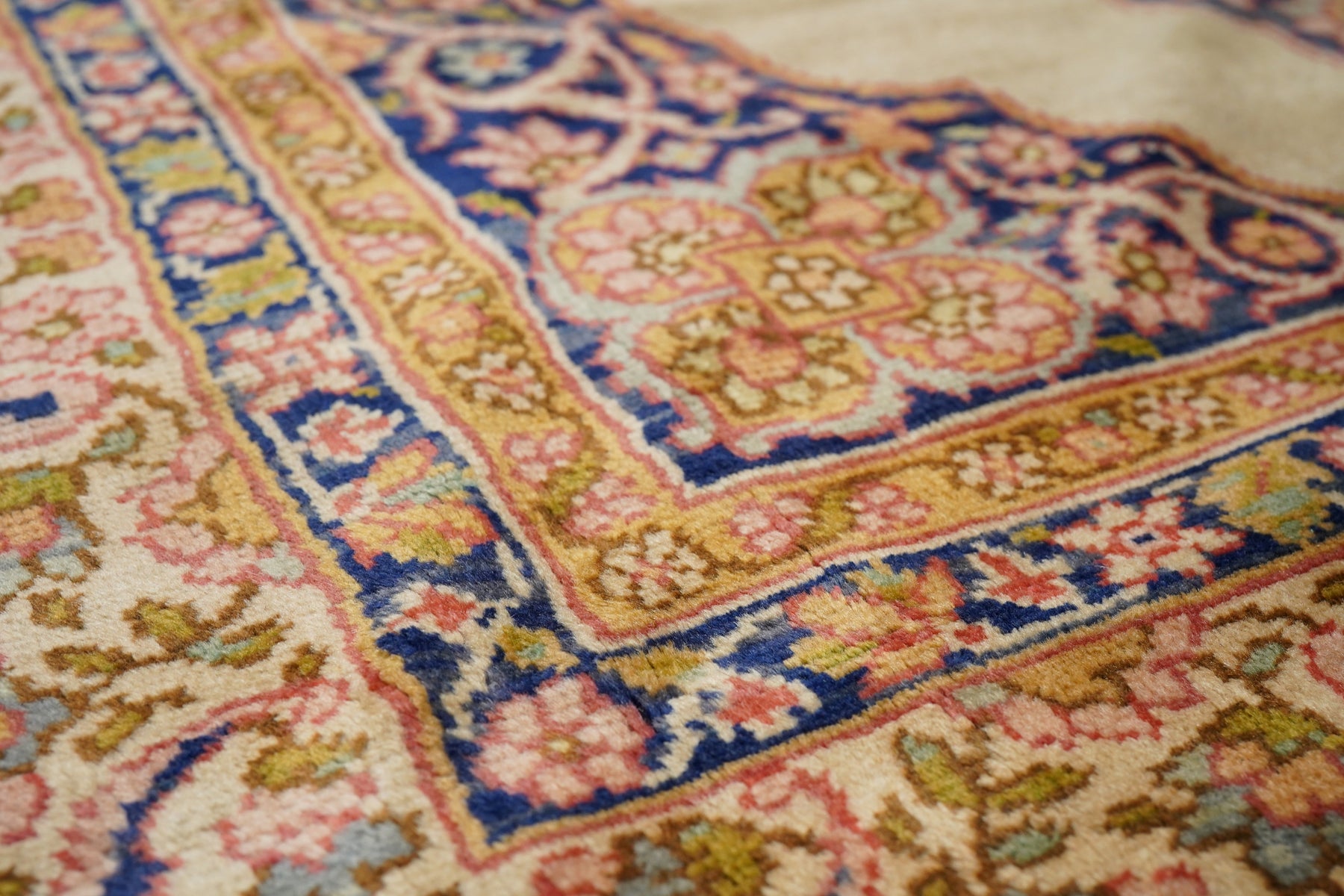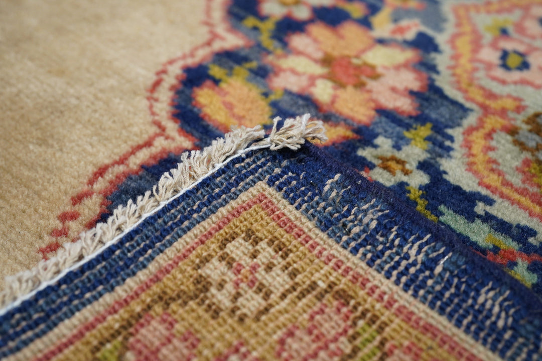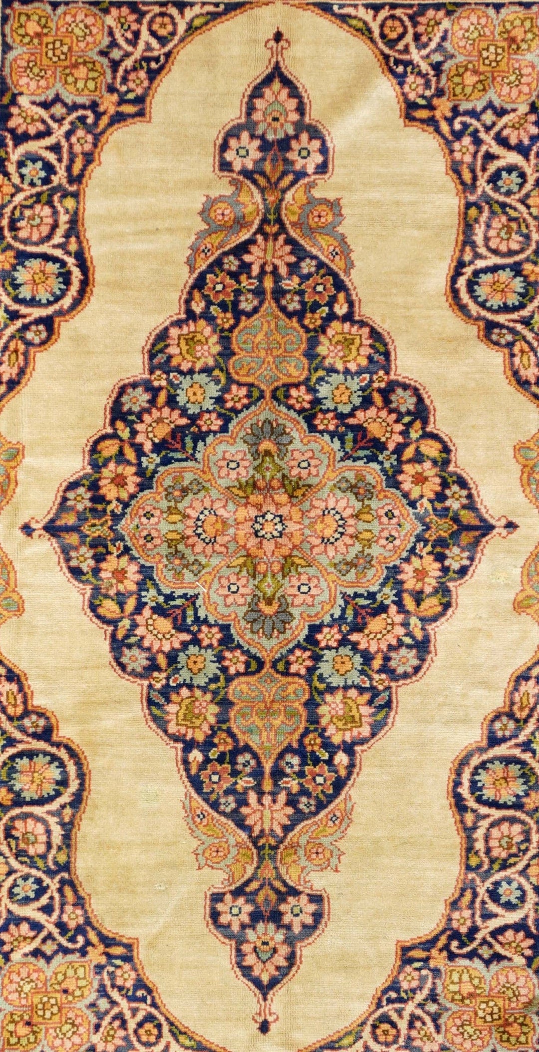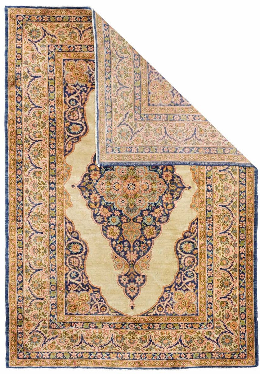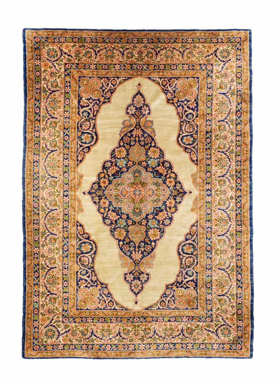 This medium-weave scatter shows a Tabriz-influenced layout with a cream-sand open field centred by a full-height royal blue scalloped palmette-filled medallion with en suite escutcheon palmettes. Royal blue corners with scrolling, volute vinery. Cream border with a semi-arcade formed from forked acanthoids. Good condition.
