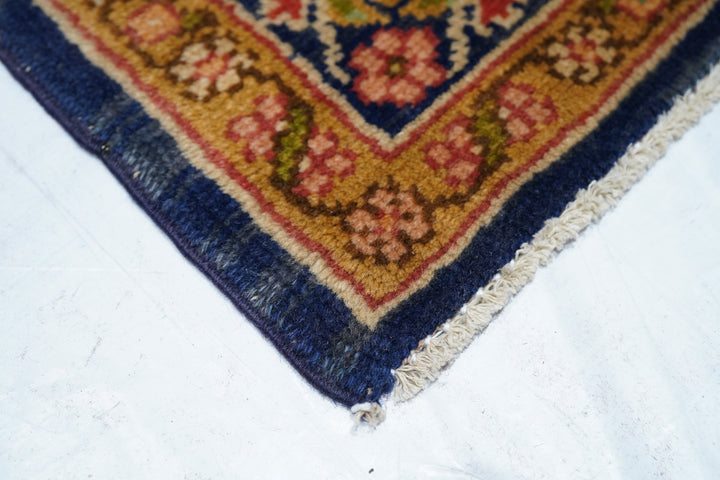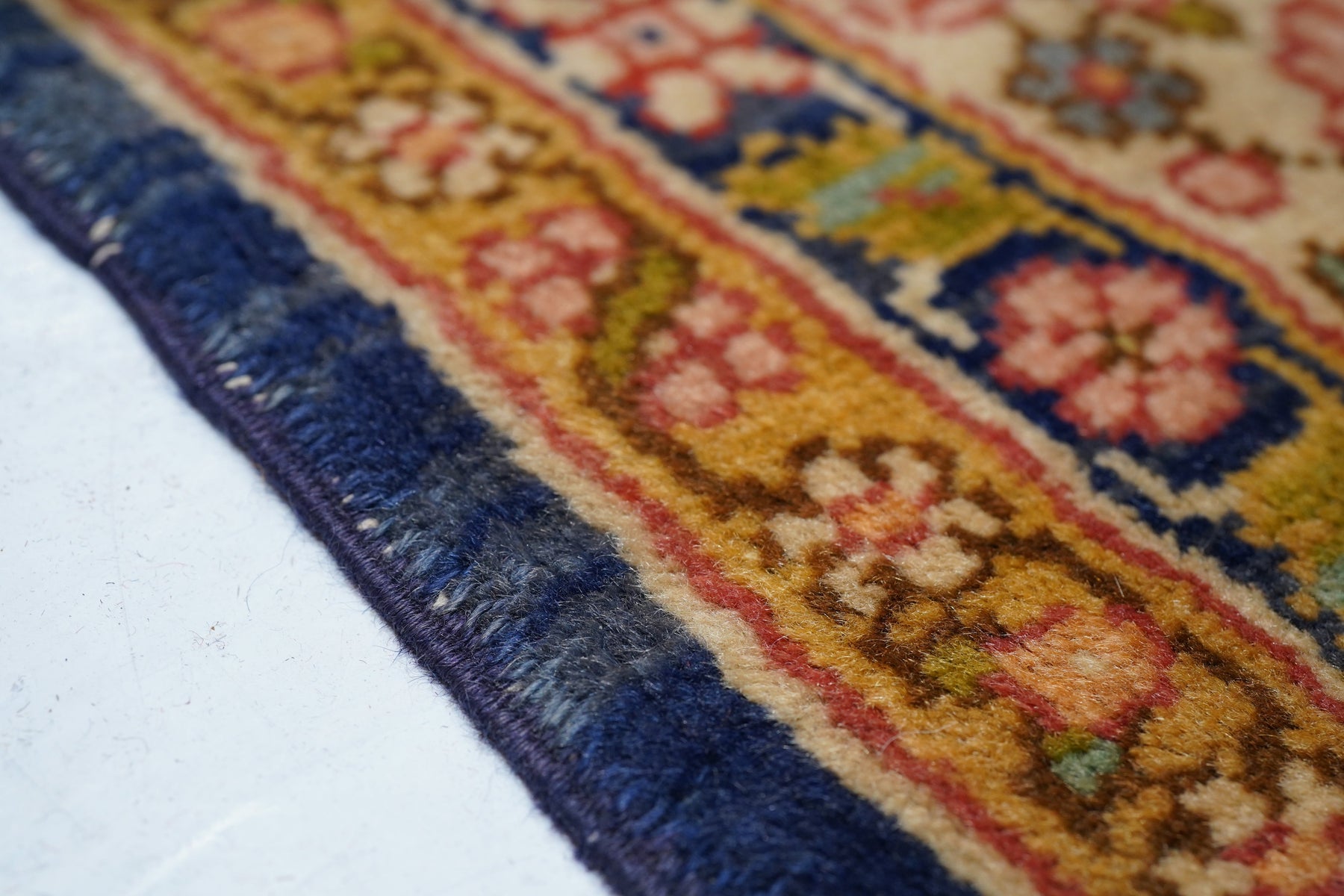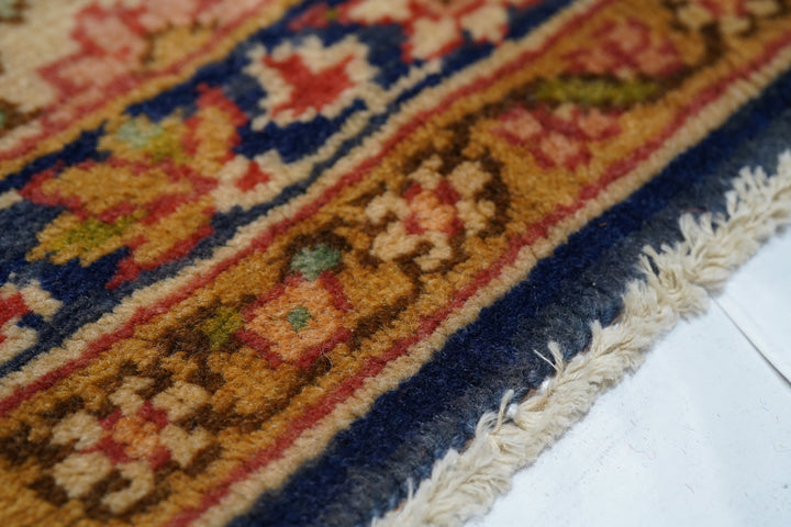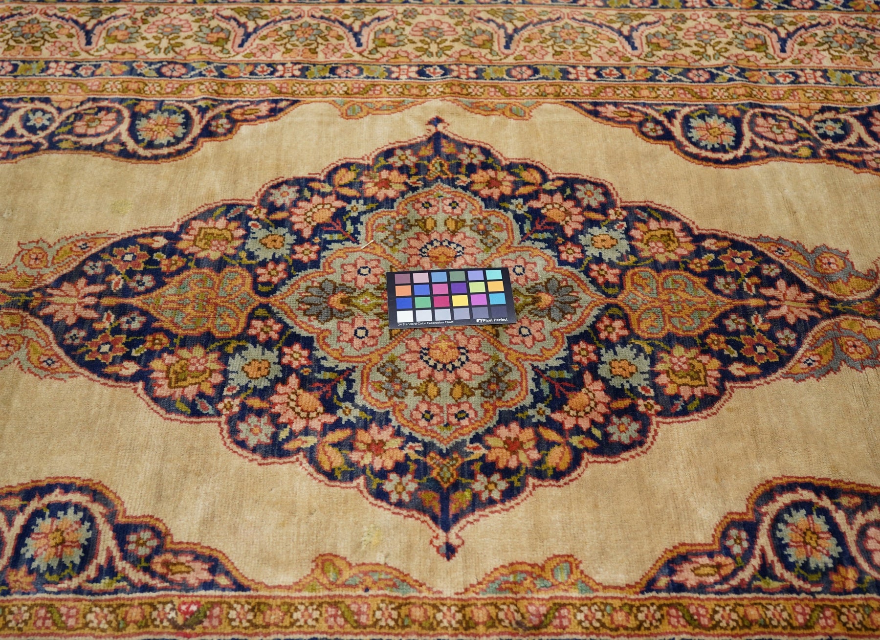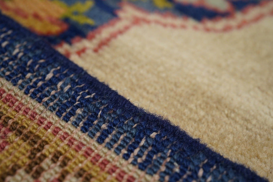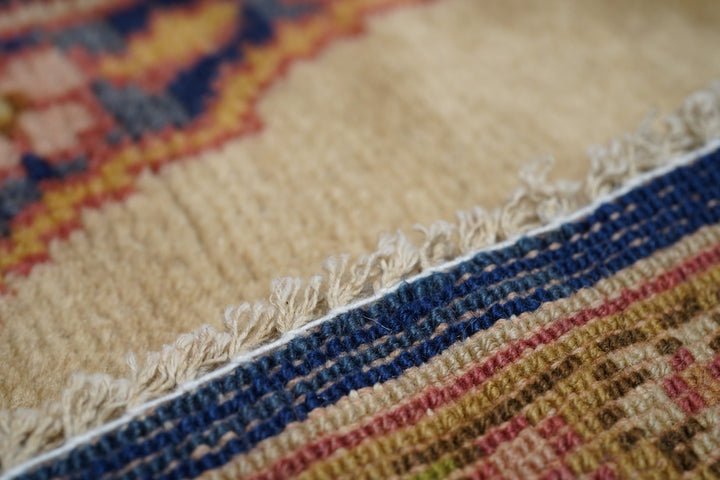 This medium-weave scatter shows a Tabriz-influenced layout with a cream-sand open field centred by a full-height royal blue scalloped palmette-filled medallion with en suite escutcheon palmettes. Royal blue corners with scrolling, volute vinery. Cream border with a semi-arcade formed from forked acanthoids. Good condition.