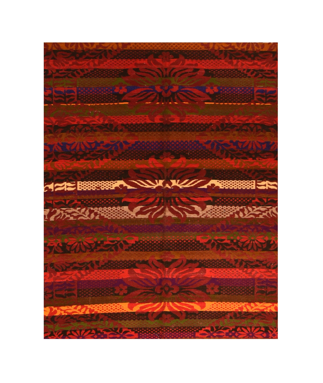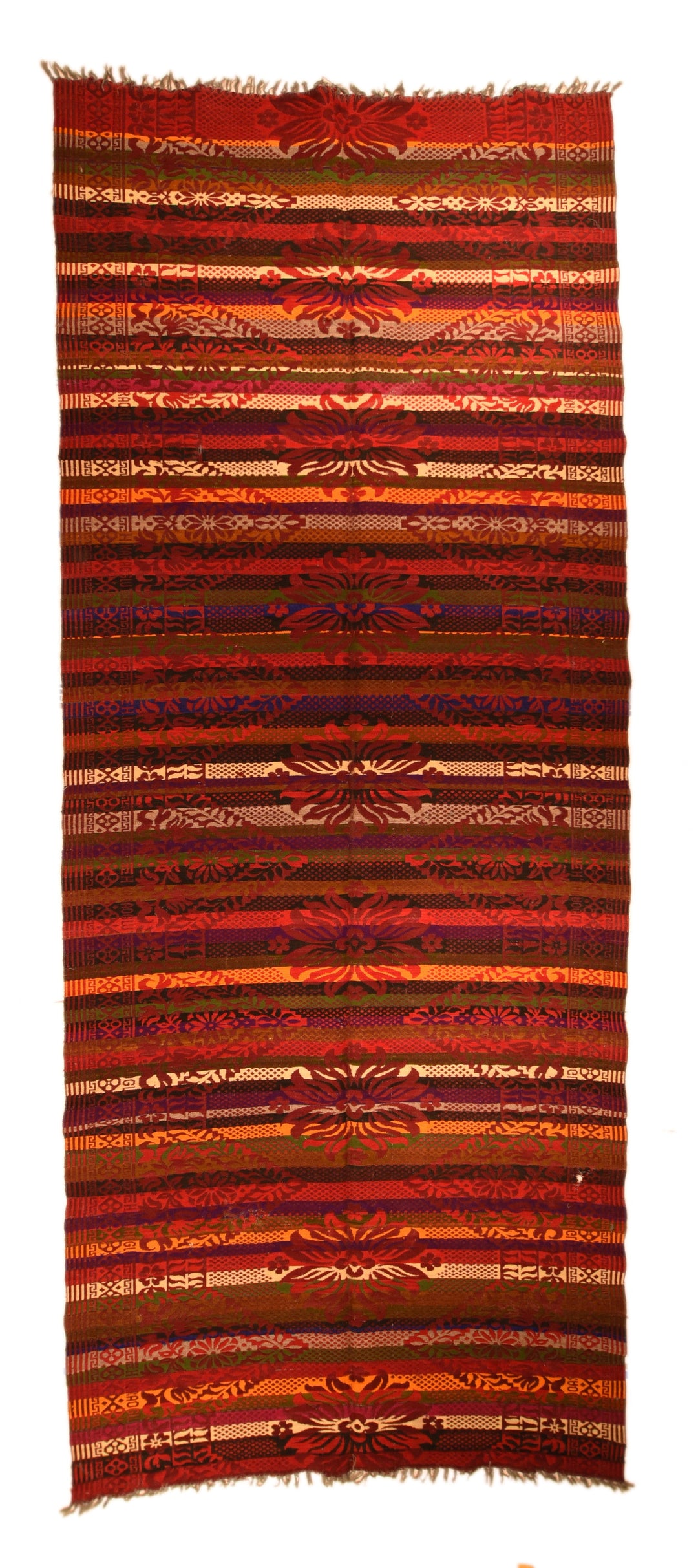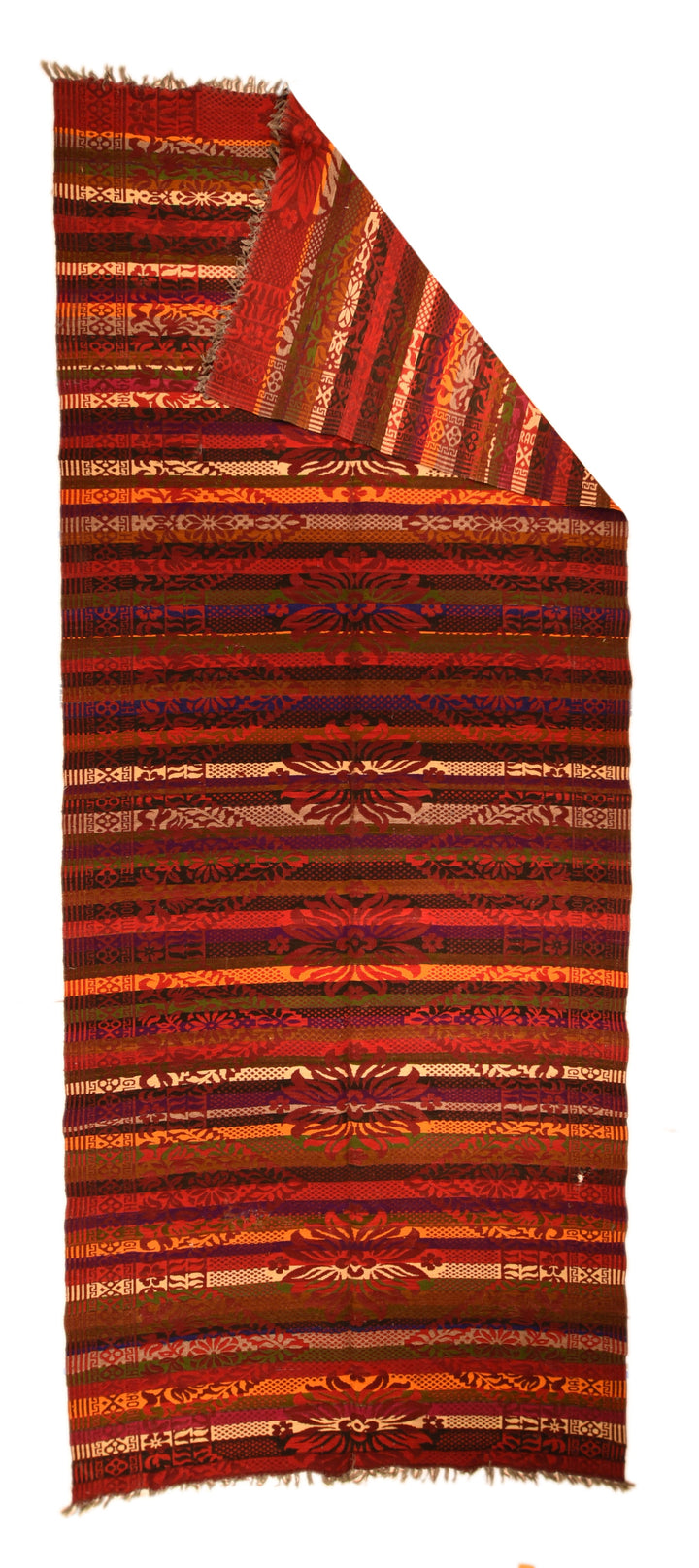 This long flatweave show a flower and lozenge pattern showing through narrow stripes of goldenrod, red, rust, ecru and royal blue. The pattern changes color in sync with the stripes. A few letters in the border hint at the weaver or Adjustable length. Very unusual color/pattern play. As new condition.