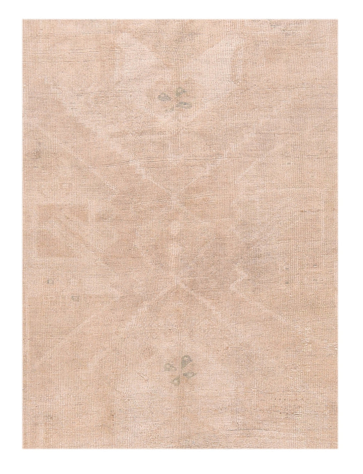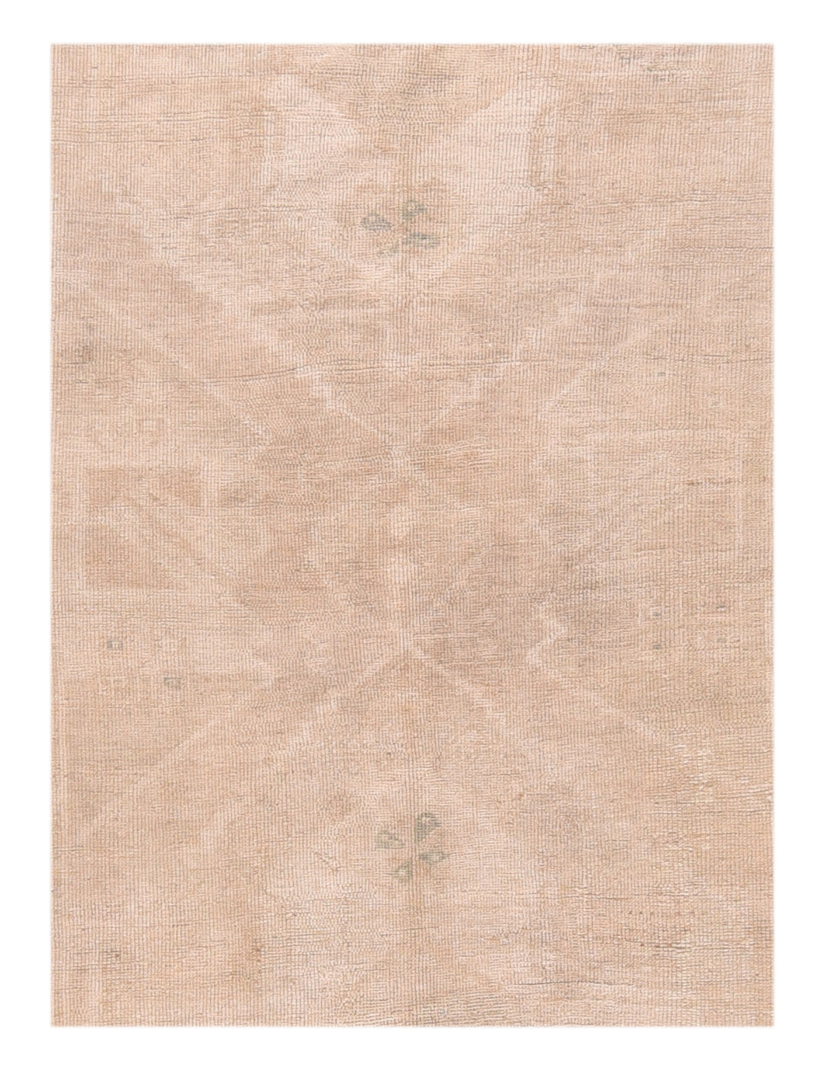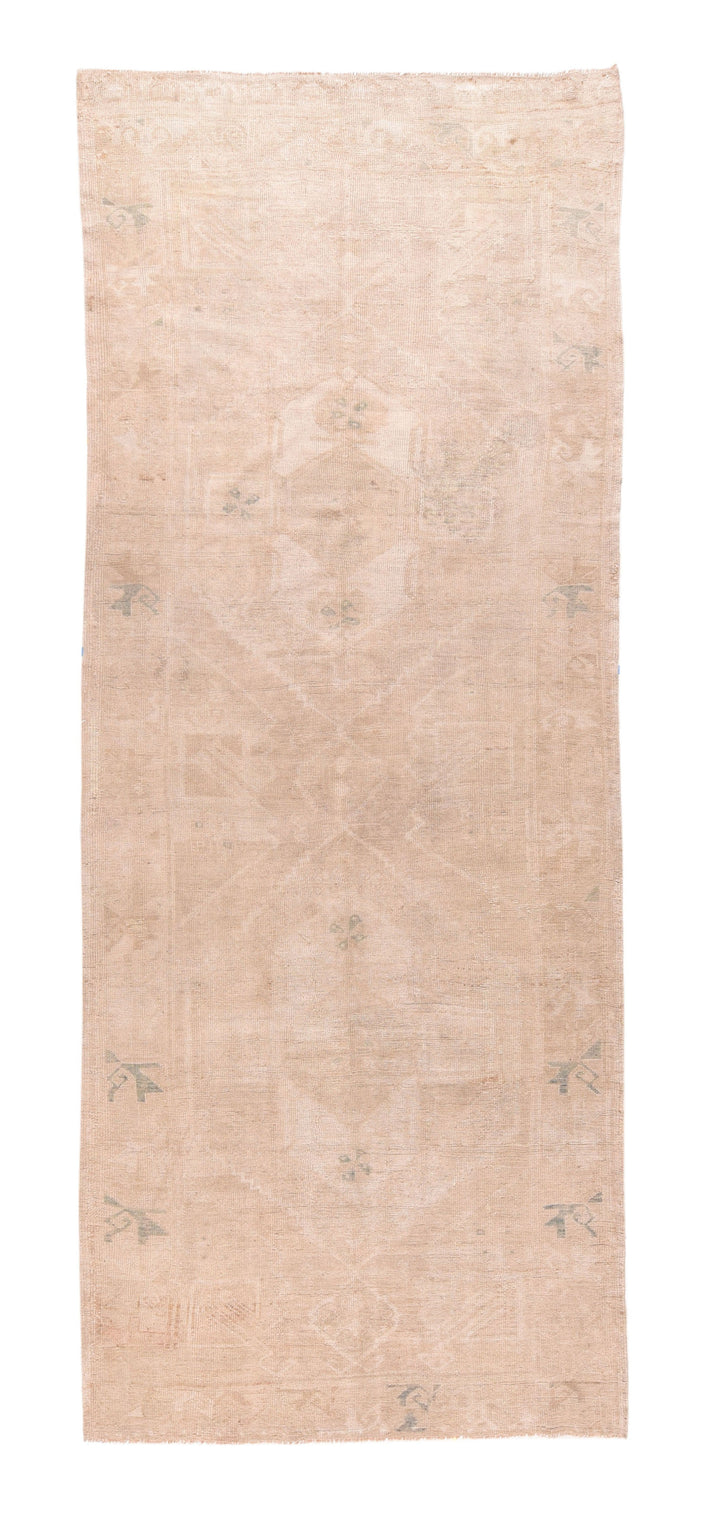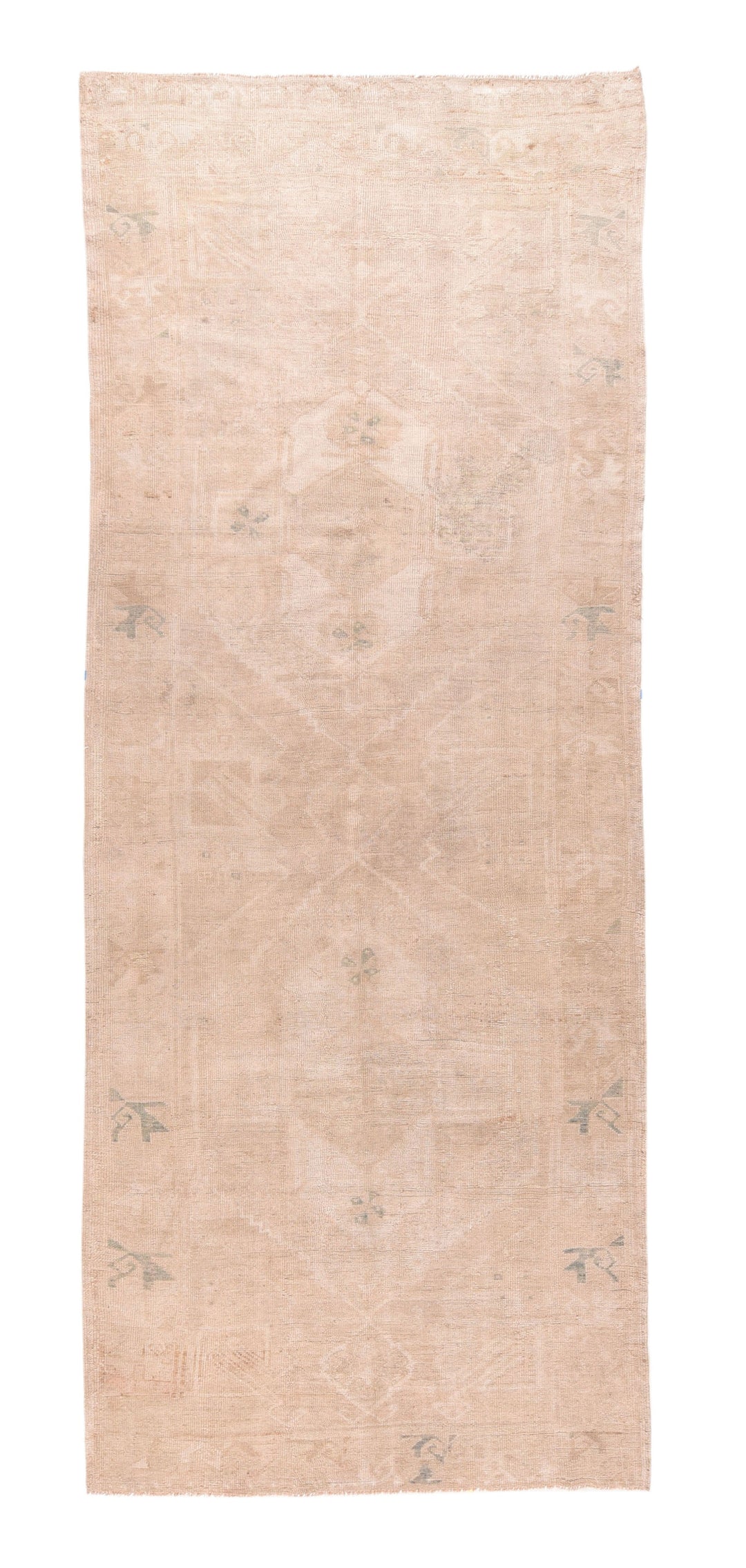 Now in beige, sand and pale tan tones, this central Turkish village kellegi (long rug) shows two characteristic cross-in-hexagon medallions, with a few slightly darker details. Tan border with tan palmettes. Wool foundation. Medium weave. Good condition.