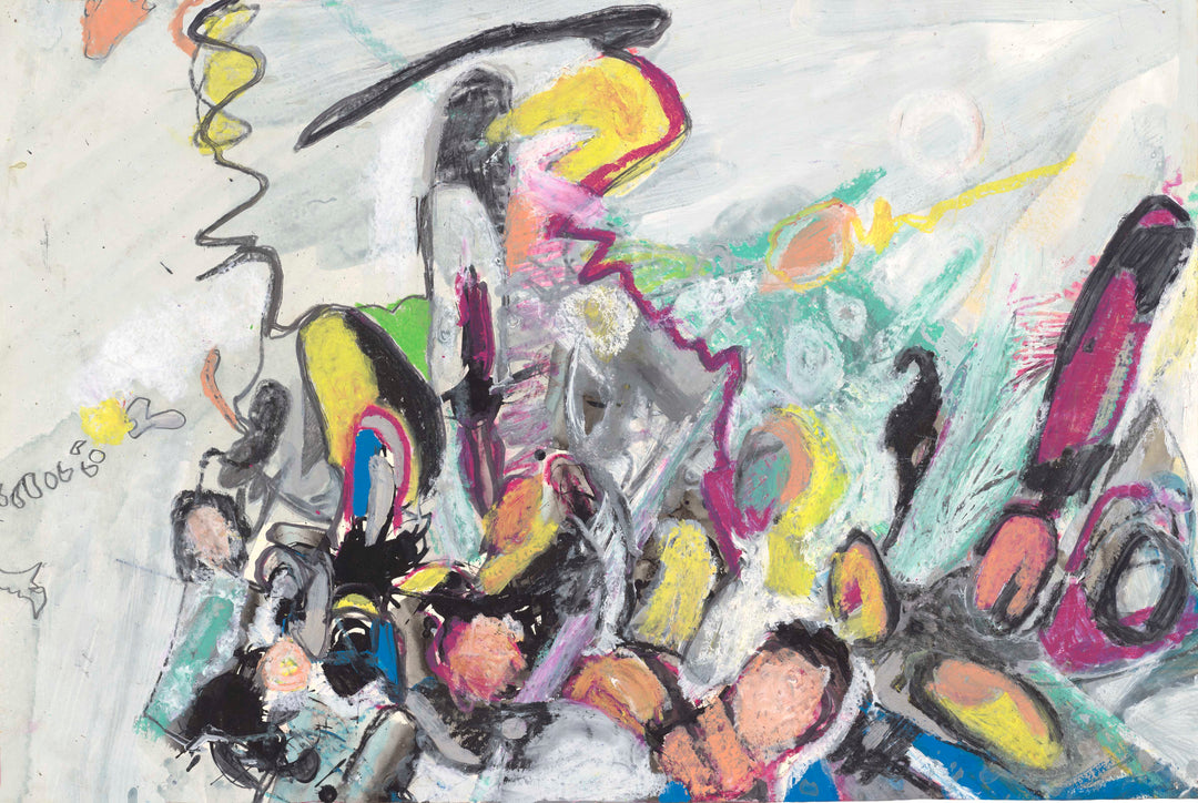 Abstract - Paper with some dirt. Ink, gouache, charcoal, and acrylic on heavyweight, acid-free, artist paper. 16' x 23' (40 x 59 cm)