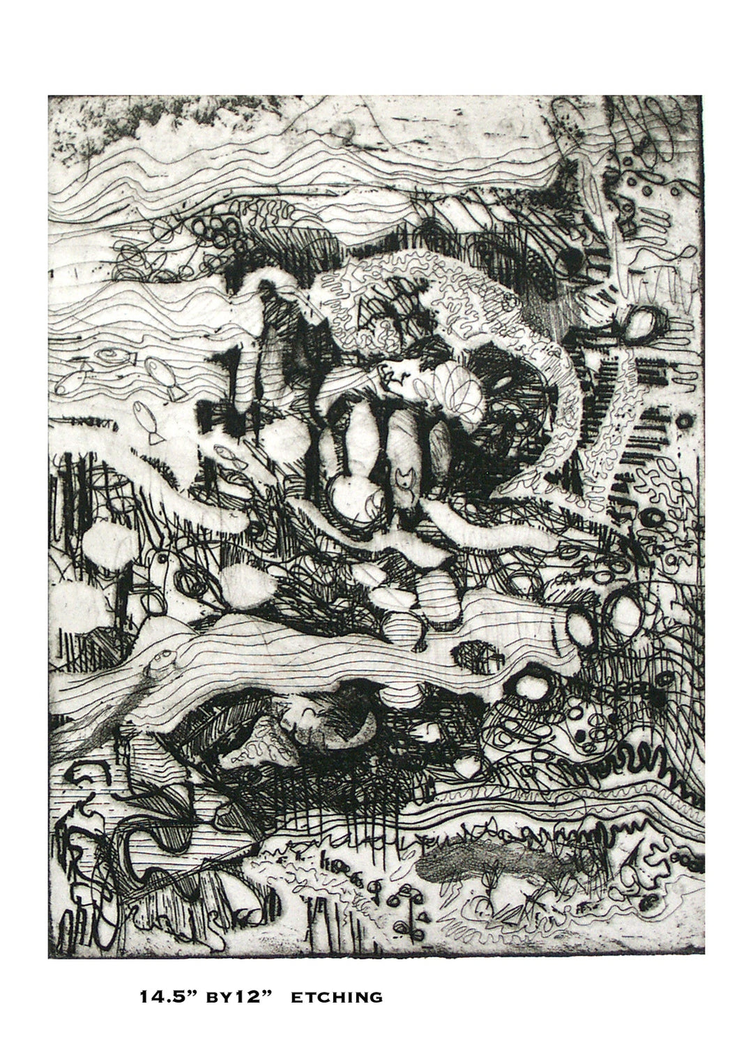 Imaginary Landscape conveys joy and a love of nature as it depicts an enchanted landscape: insinuating rivers of swimming fish and caves with cute animals.Etching on paper. 8'6" x 11'4" (22 x 29 cm).