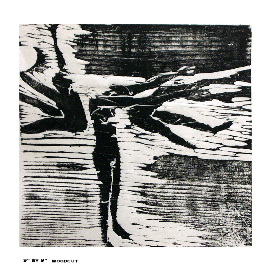 Dragged is a wood print: it conveys a sense of movement, depicting figures that look to be blown about by the wind. Wood cut on paper. 9' x 9' (23 x 23 cm).