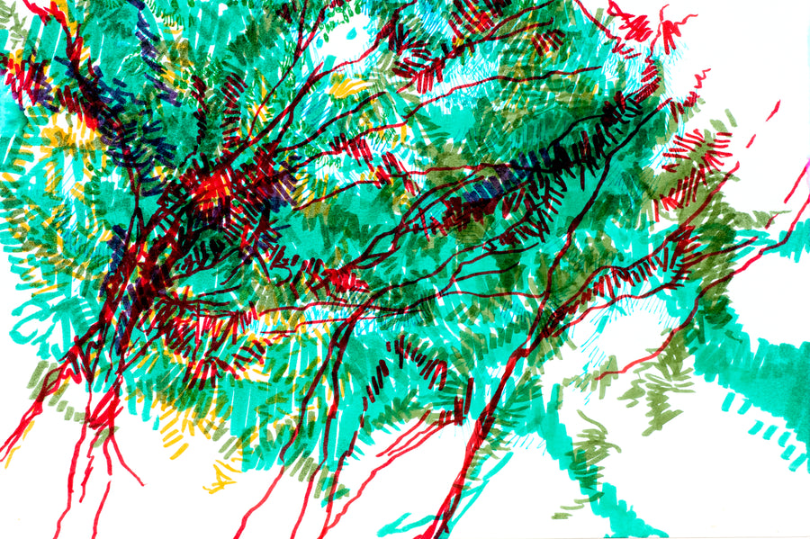 Abstract with green and red lines. Markers on paper. 7' x 10' (17.2 x 25.4 cm).