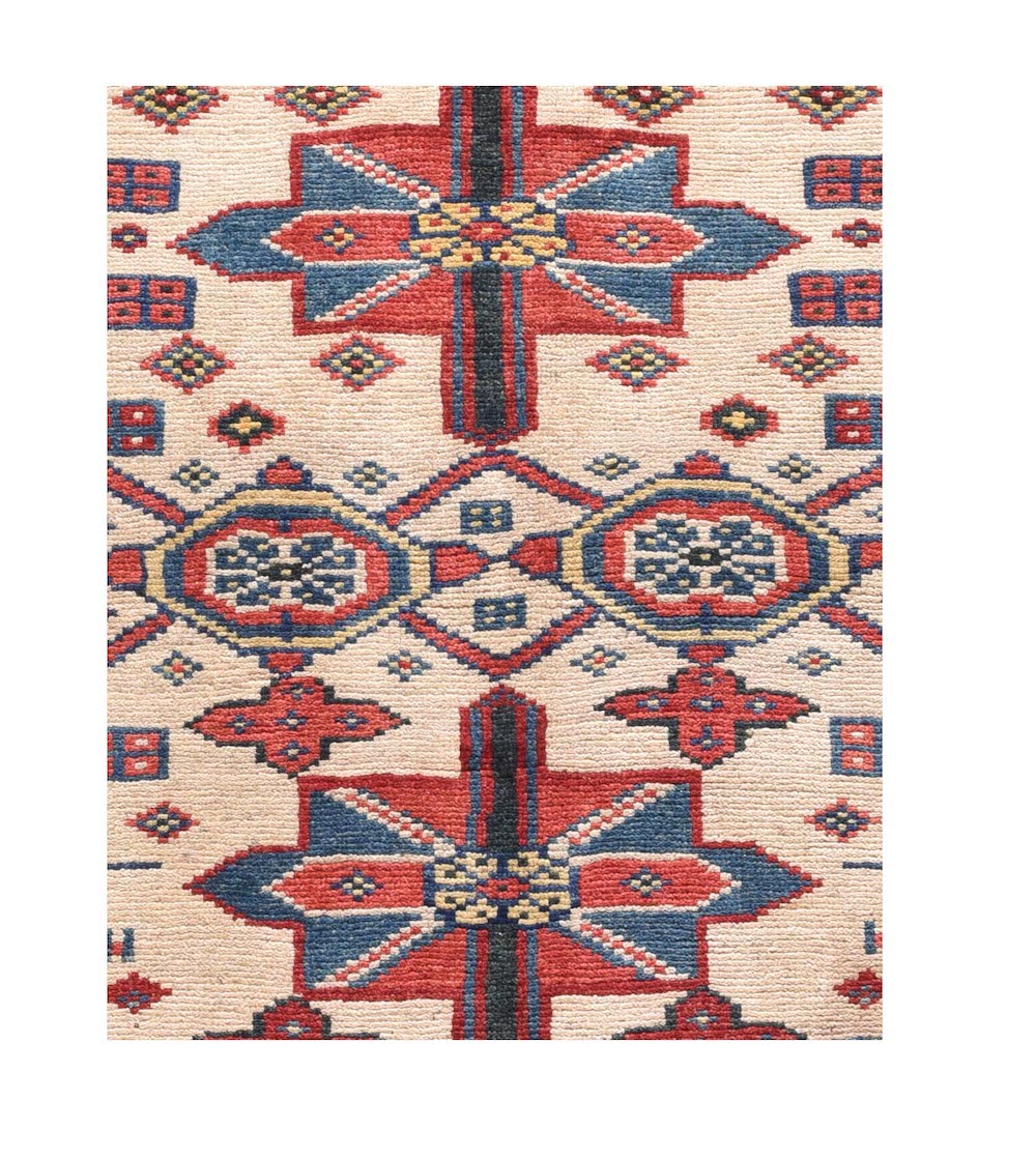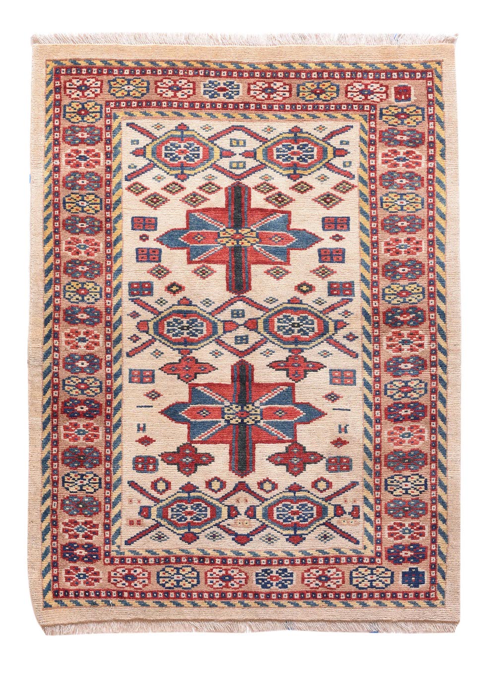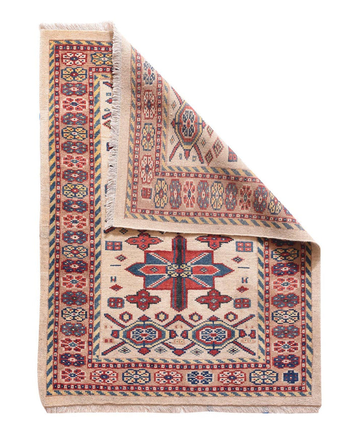 In the Karaja manner, but much more evenly woven, this attractive scatter shows two pointed rectangles in red and blue, on an ecru ground, with secondary rows of flattened, rosette centred octagons. Putty border with floating rosettes in straw and blue. Diagonally striped inner border in medium blue and straw. As new condition.