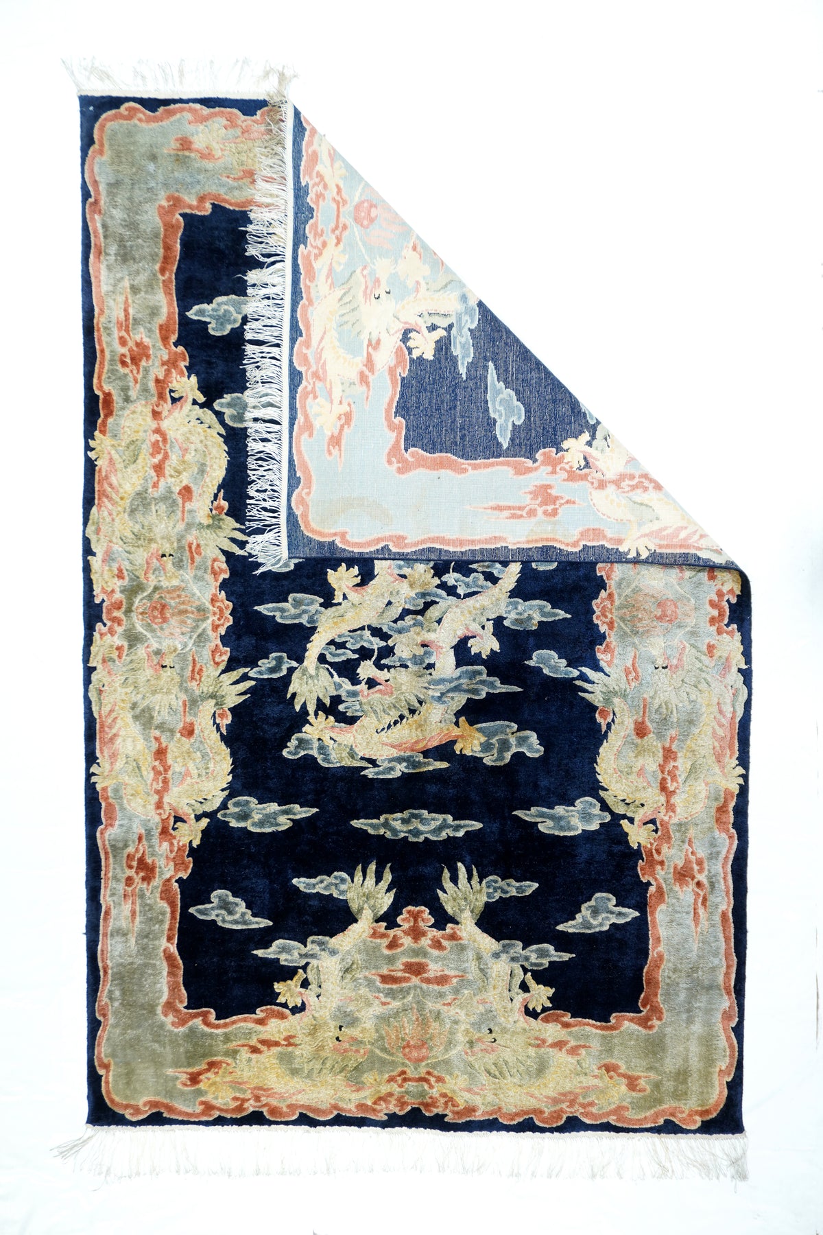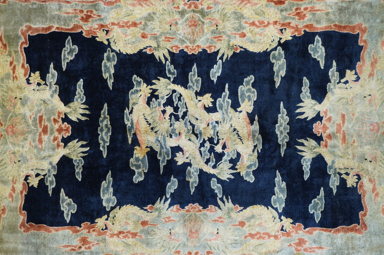 A generic term referring to any carpets made within the confines of the Middle Kingdom including: Ningxia (north central China), Peking (woven in the capital city), Tientsin (Tianjian, primarily Art Deco and from NE China, Xinjiang Province, (western China), Tibetan and Mongolian, from the 16th century onward, in sizes ranging from small ruglets to enormous palace – sized creations, and generally with wool pile. Round and oval rugs. Prices range from inexpensive to moderately pricey.
