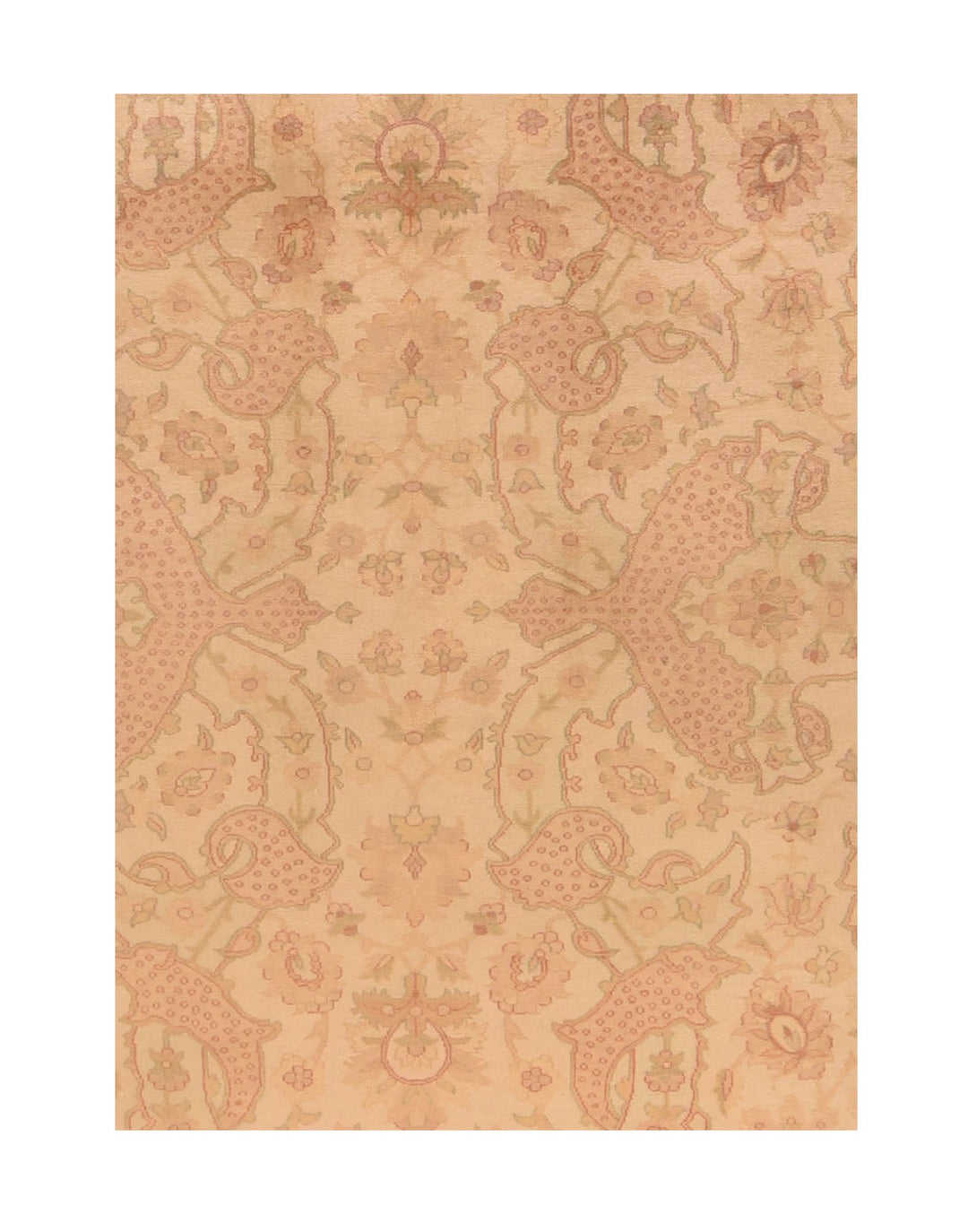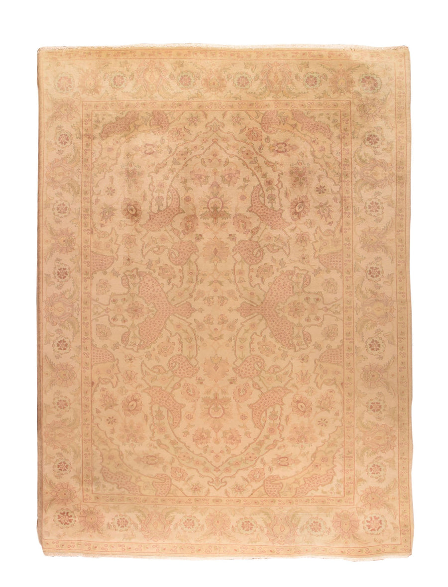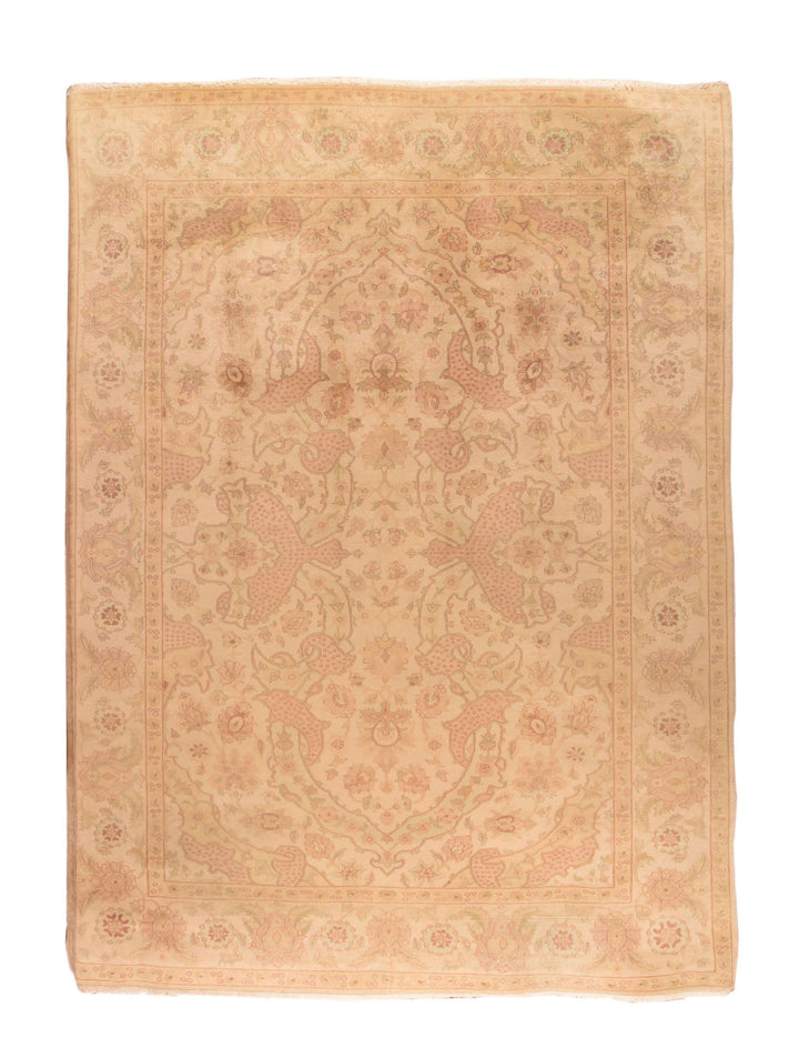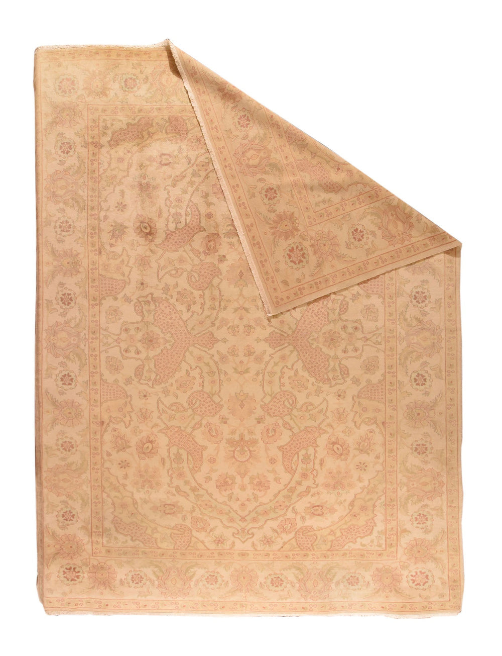 Although light toned and moderately woven, this softly decorative piece shows a bold design of a tall, open, central strap work cartouche, with strap work corner sections, all in tones of sand-straw and light brown. Tonally en suite border with leaf-winged reversed palmettes. Good condition.