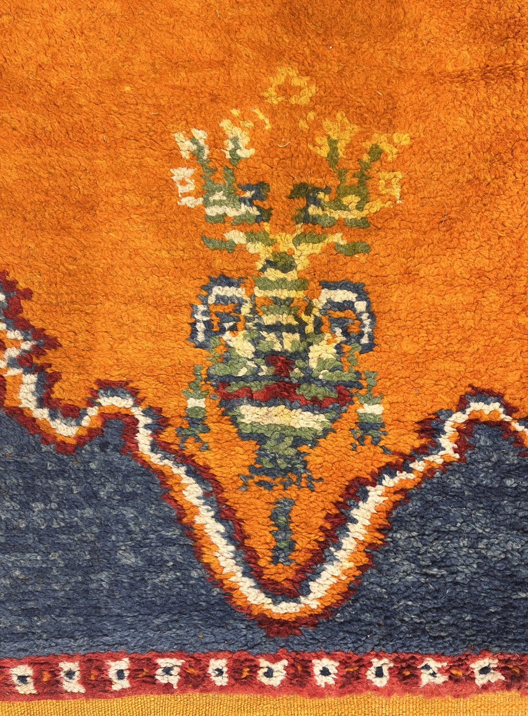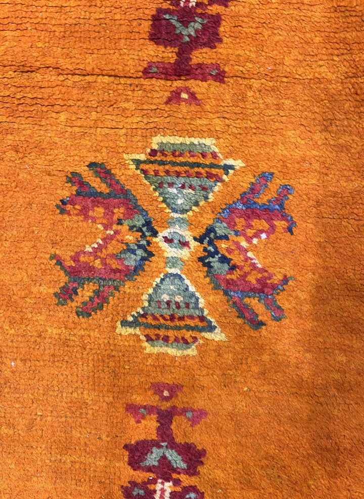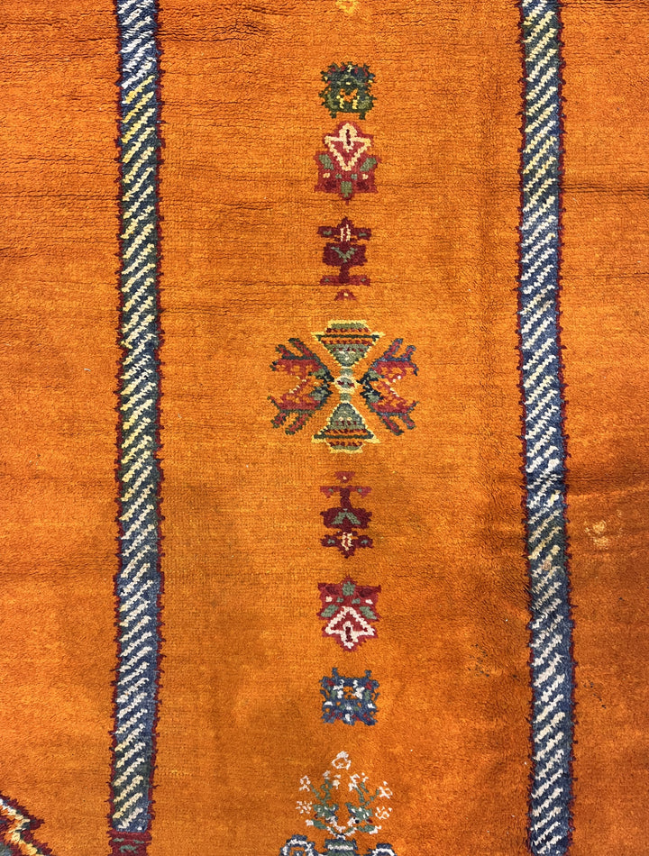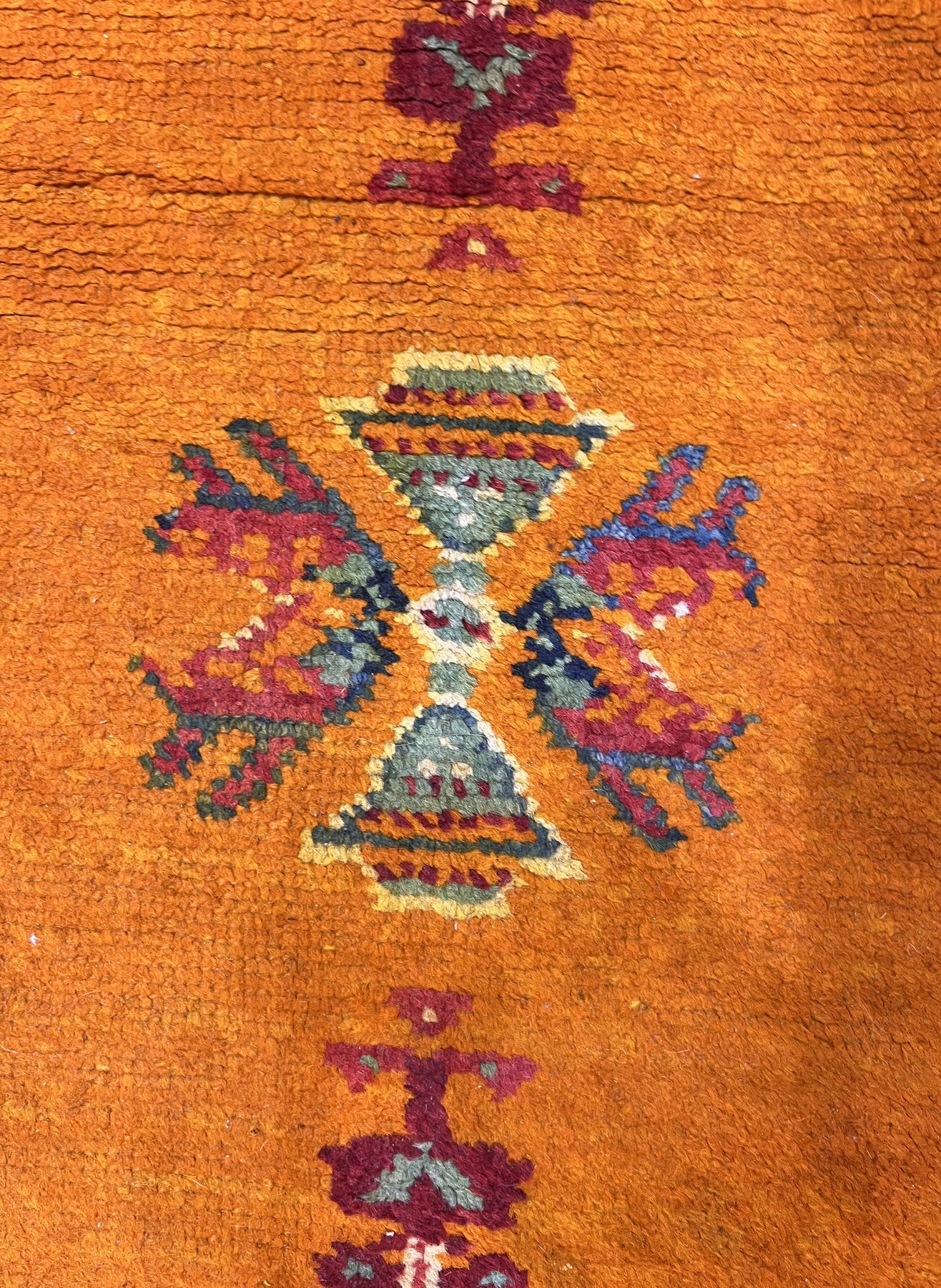 Comprising both the nomadic Berber rugs of the Atlas Mountains, with very thick piles, coarse knotting and limited palettes, and the more colorful, coarse to moderate rugs woven around Rabat, often with Anatolian patterns. Generic type also includes mixed technique rustic pieces. Long rugs, also runners and scatters.
