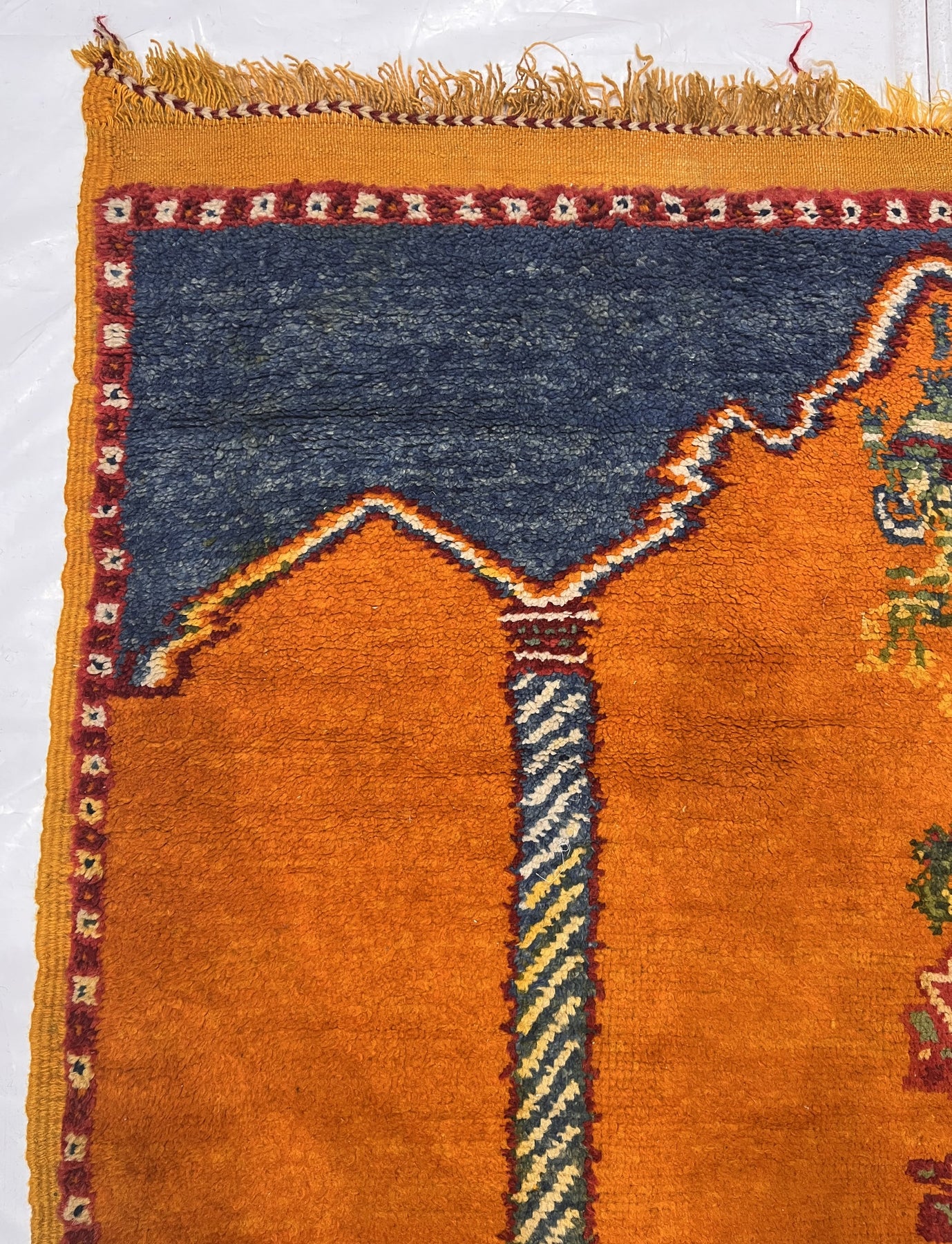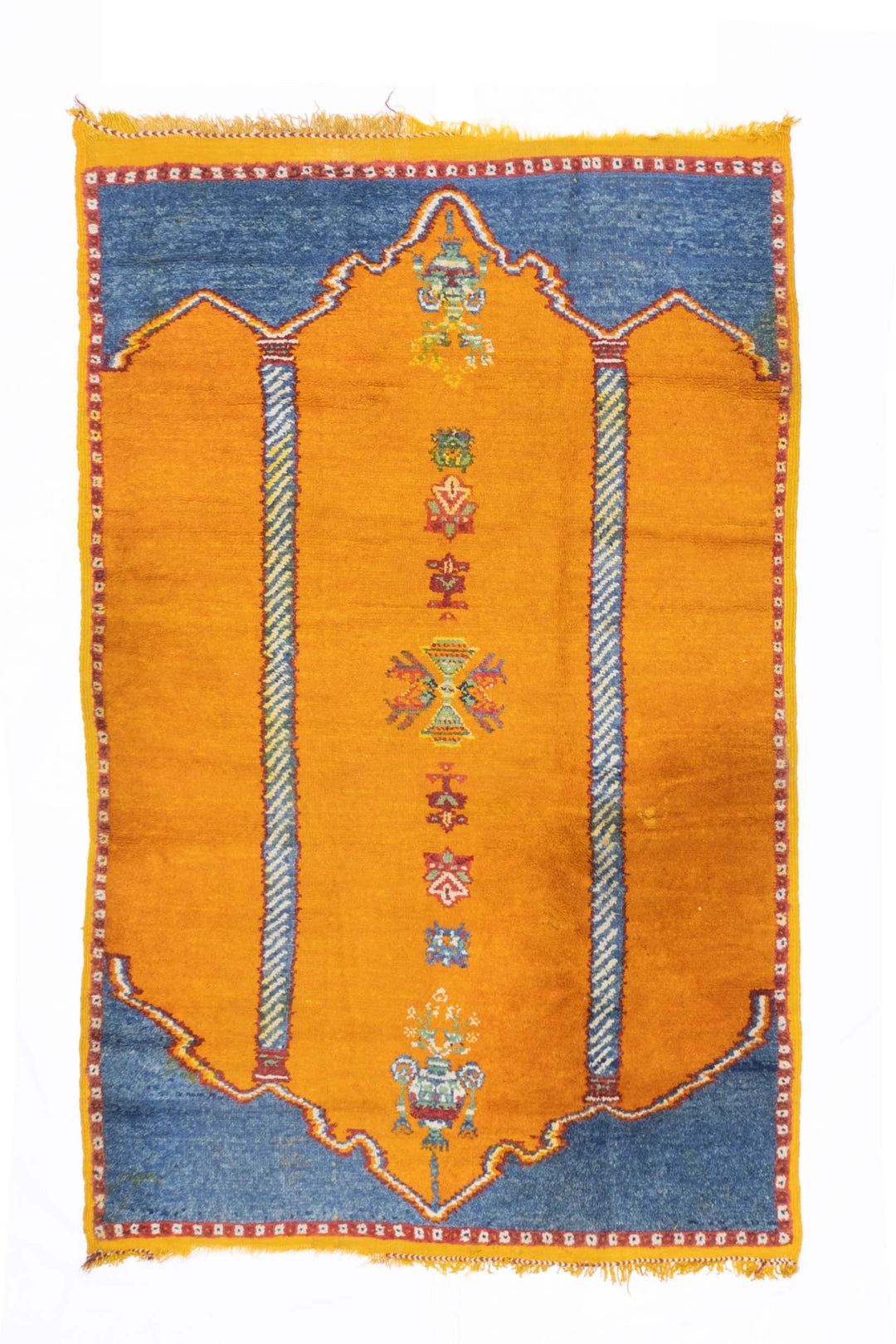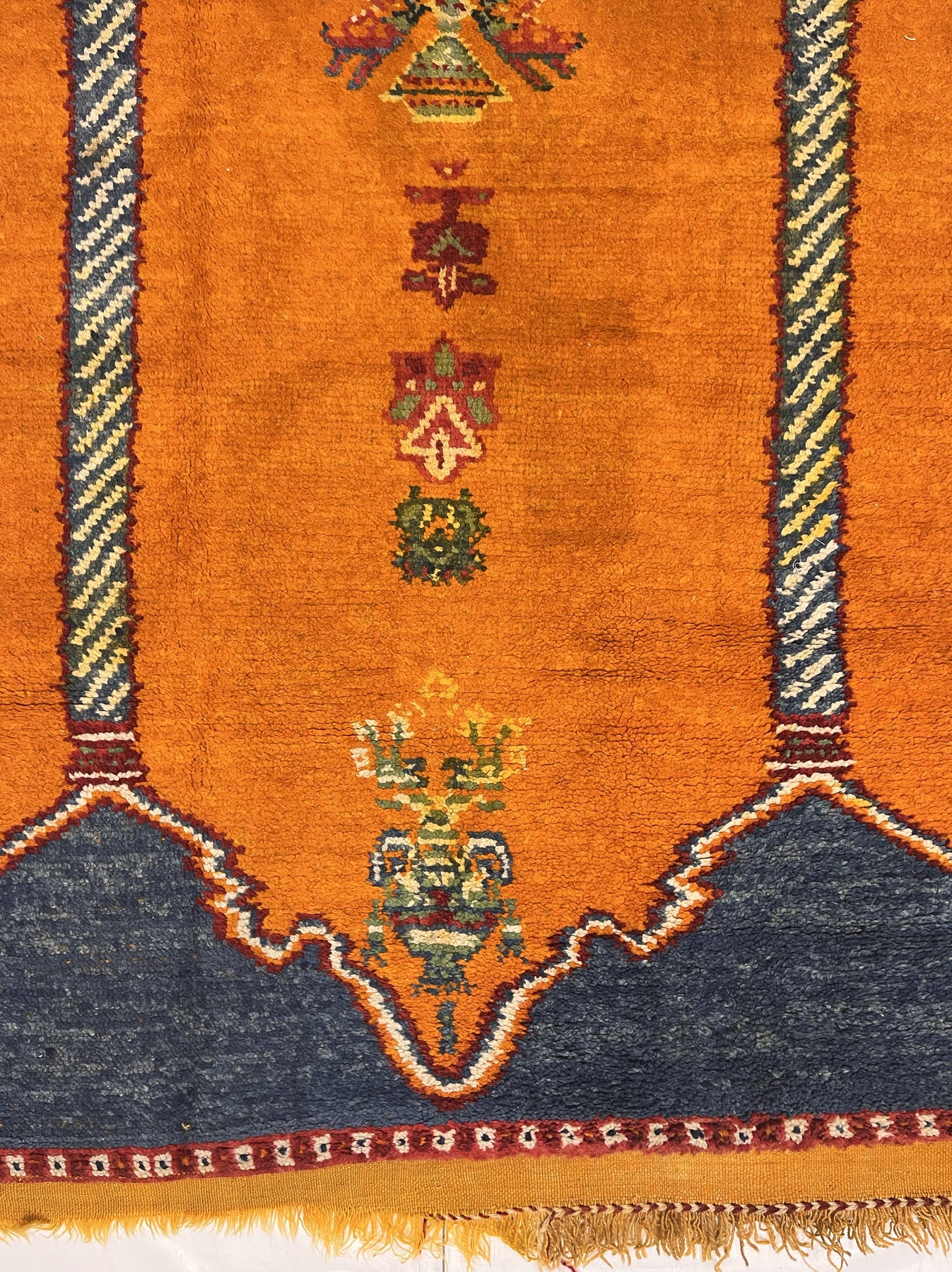 Comprising both the nomadic Berber rugs of the Atlas Mountains, with very thick piles, coarse knotting and limited palettes, and the more colorful, coarse to moderate rugs woven around Rabat, often with Anatolian patterns. Generic type also includes mixed technique rustic pieces. Long rugs, also runners and scatters.