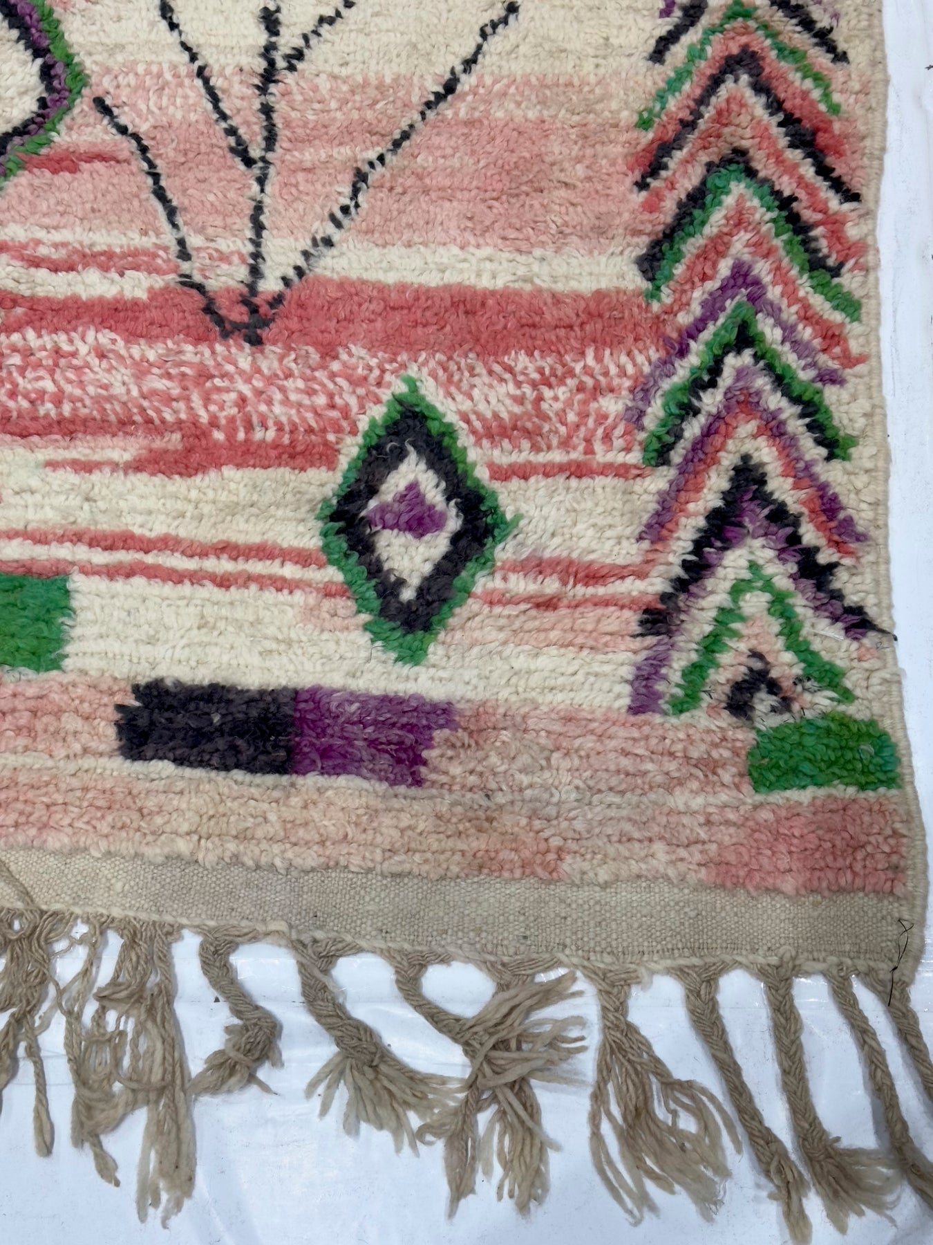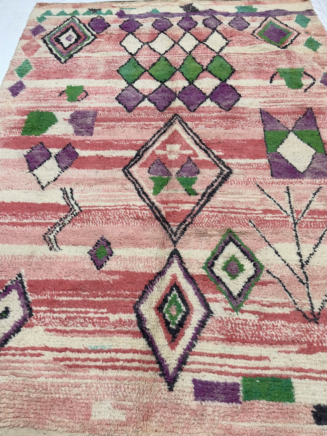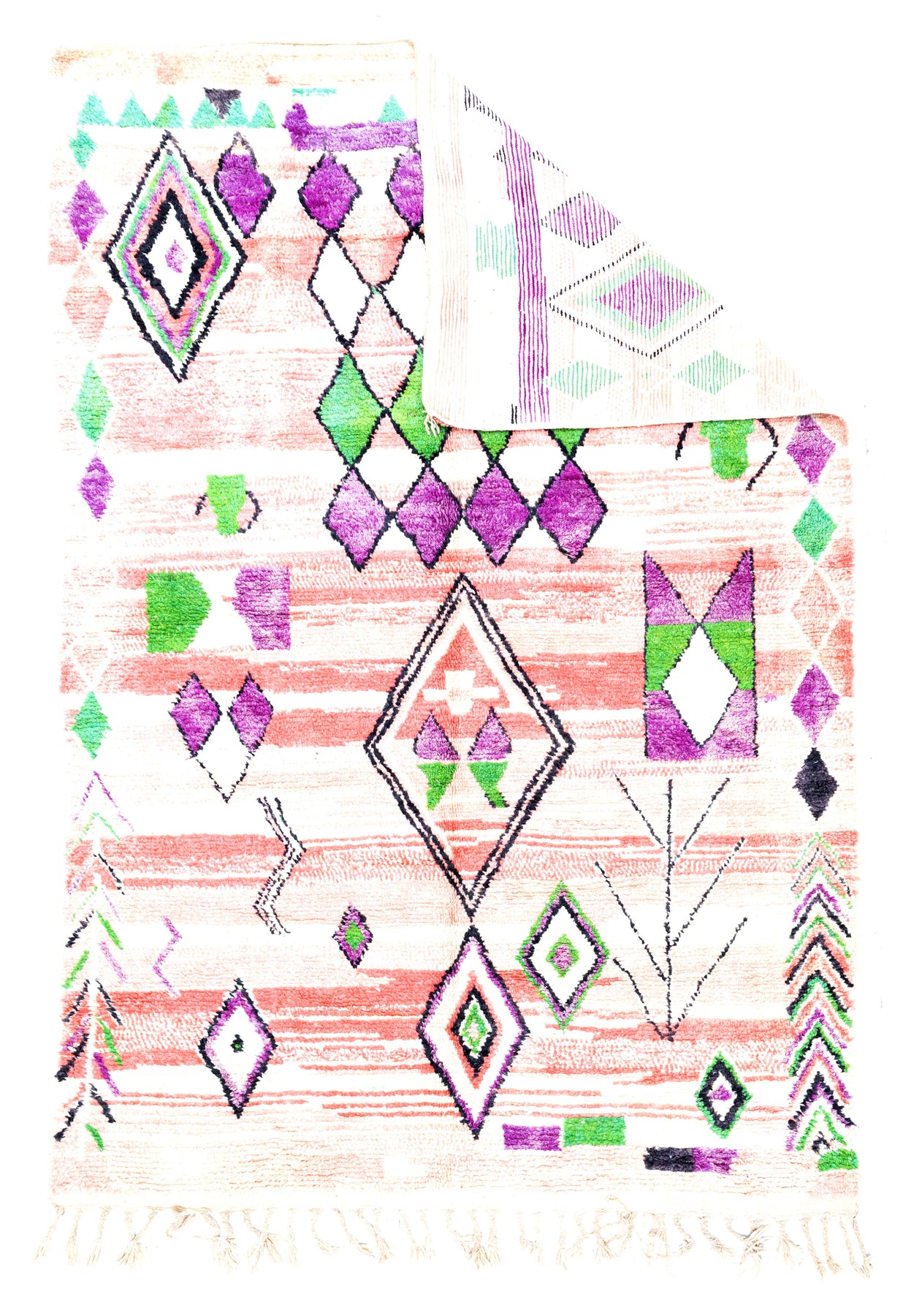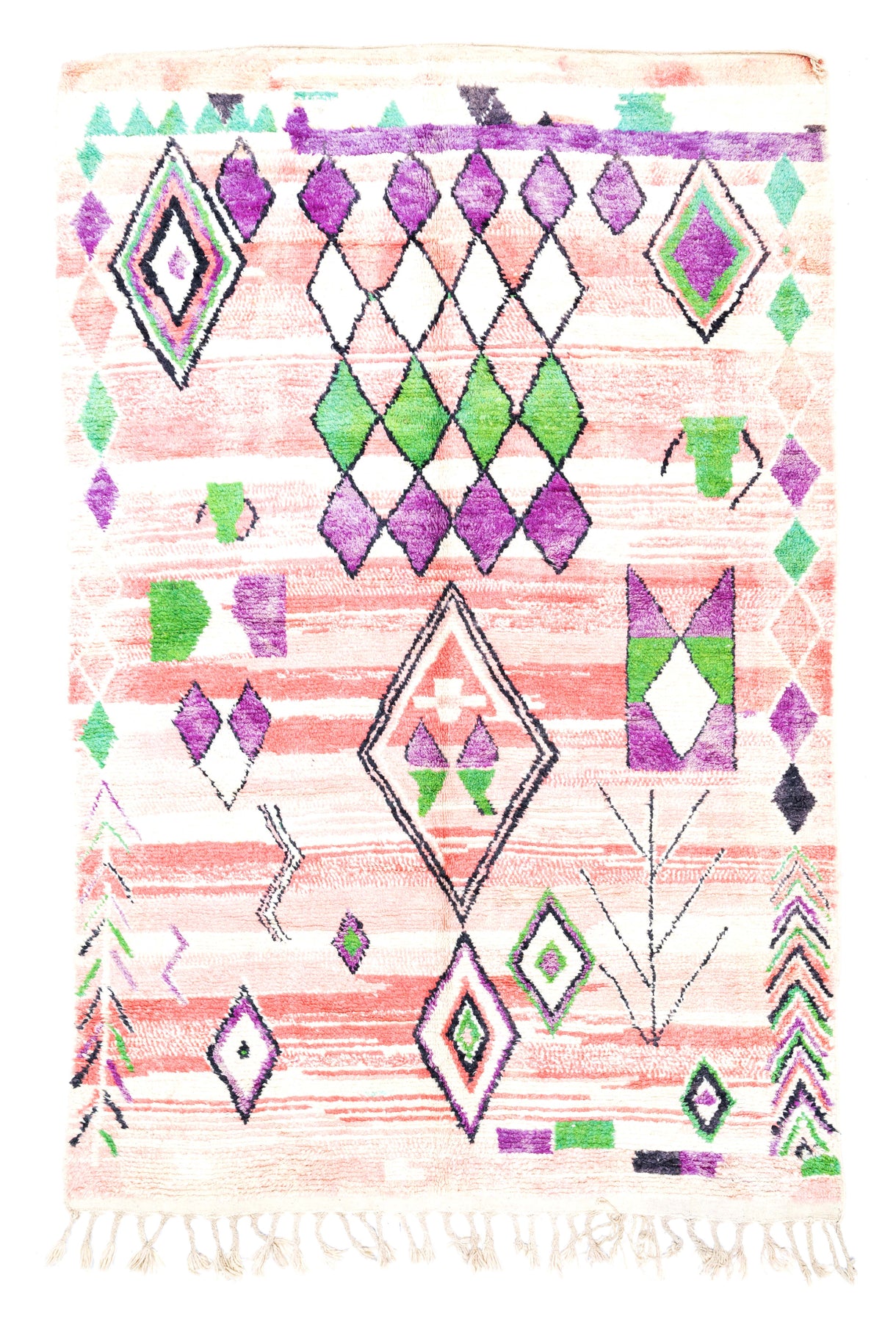 Comprising both the nomadic Berber rugs of the Atlas Mountains, with very thick piles, coarse knotting and limited palettes, and the more colorful, coarse to moderate rugs woven around Rabat, often with Anatolian patterns. Generic type also includes mixed technique rustic pieces. Long rugs, also runners and scatters.