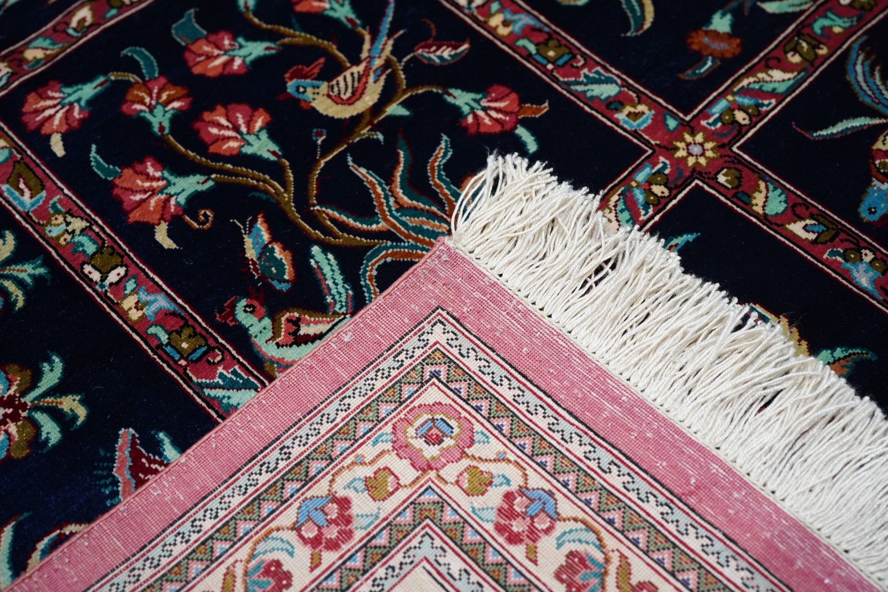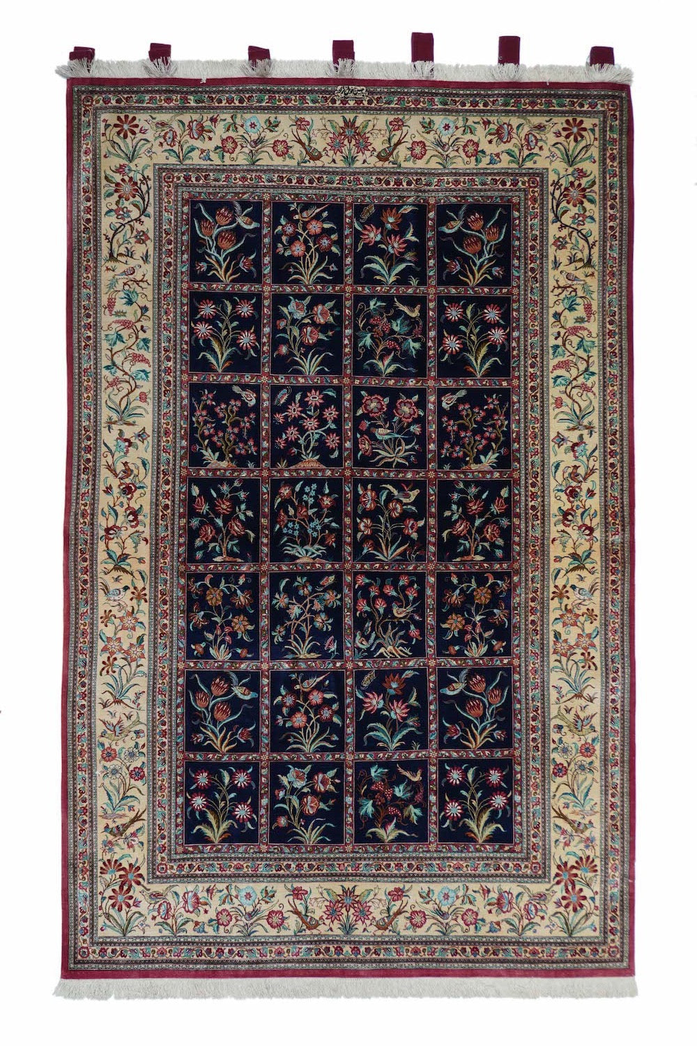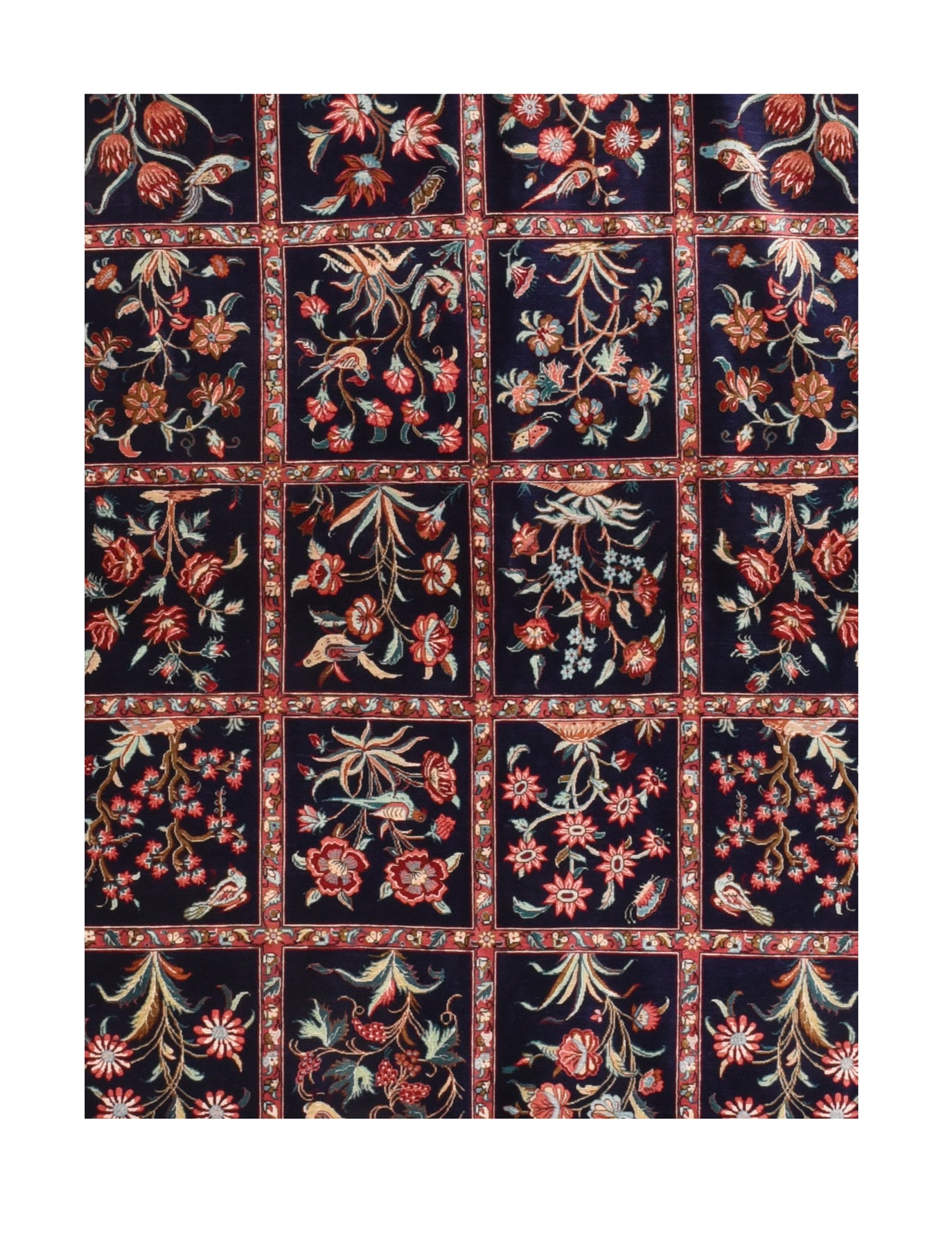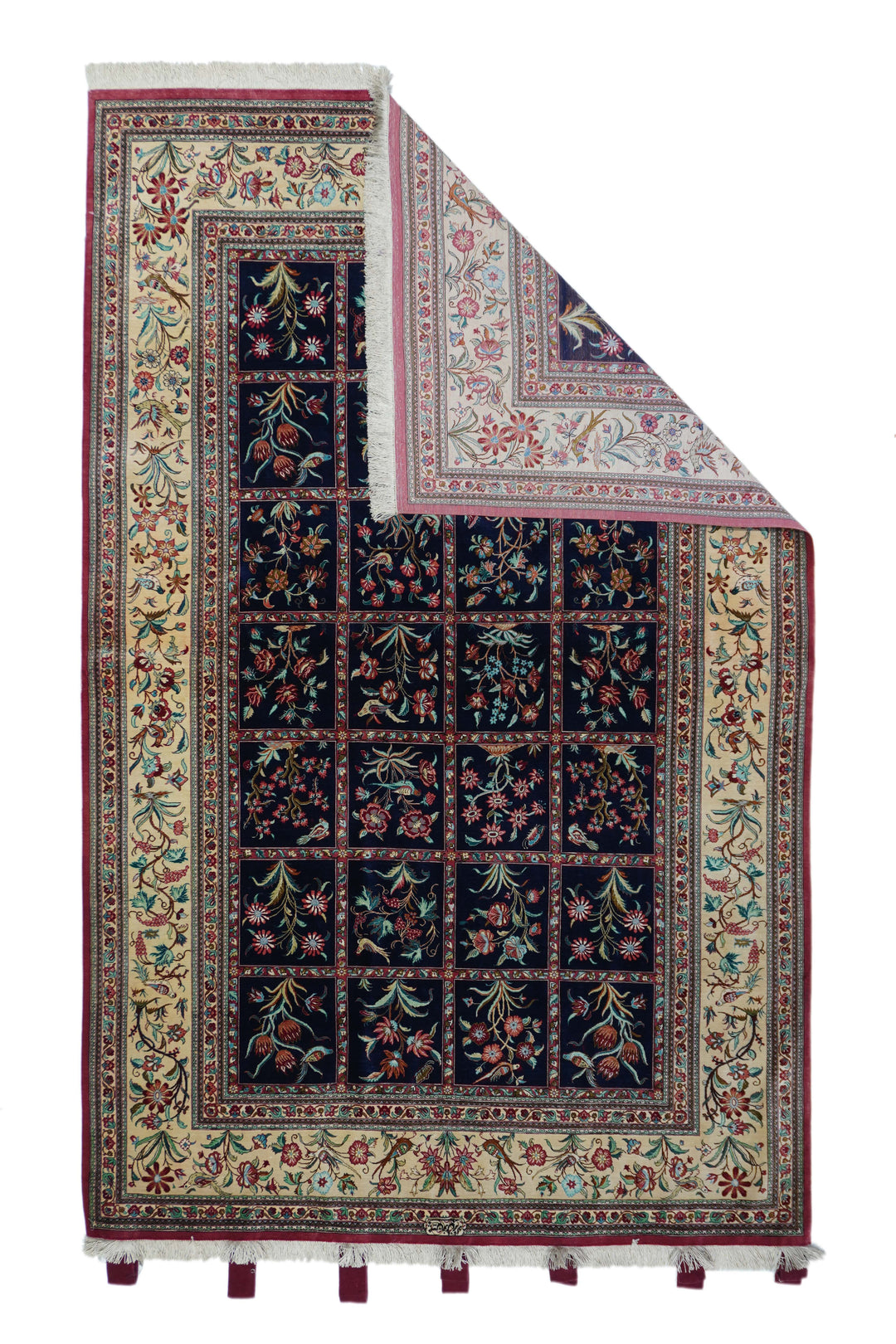 This recent, central Persian echte-city scatter shows a closely knotted silk pile in a four by seven square panel design on darkest blue, with a variety of single flowers in each panel., and some occasional tiny perching birds. Straw-cream border of vine sections, flowing leaves, flowers and perching birds. Even and professional weave. Panel/garden layout Qums are among the most popular of the genre. As new condition.