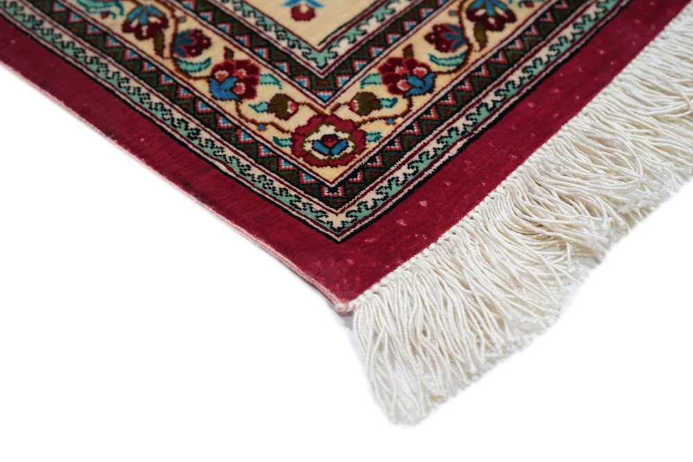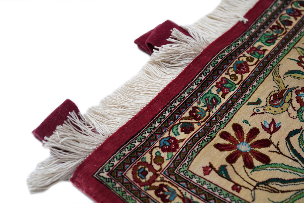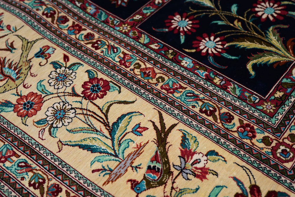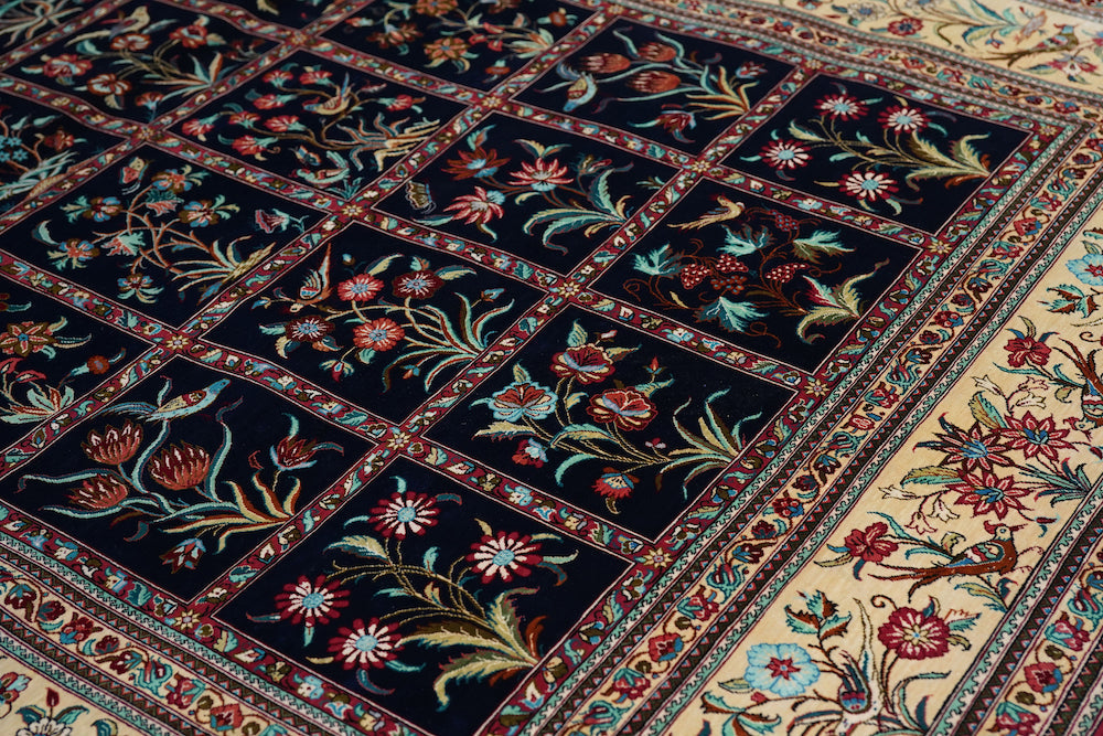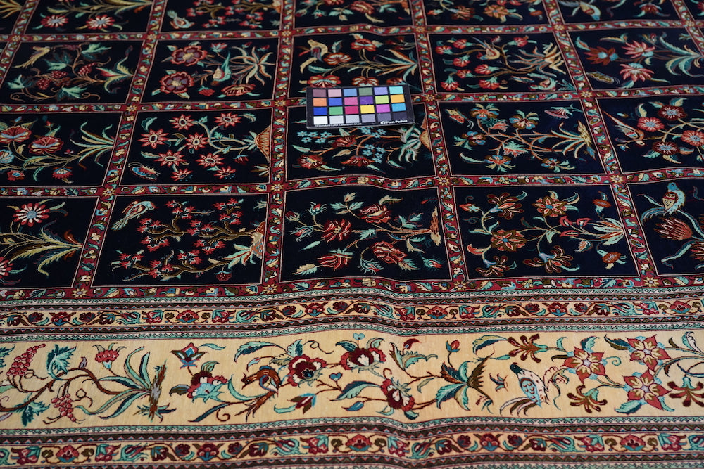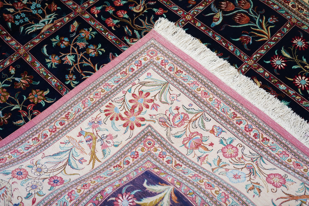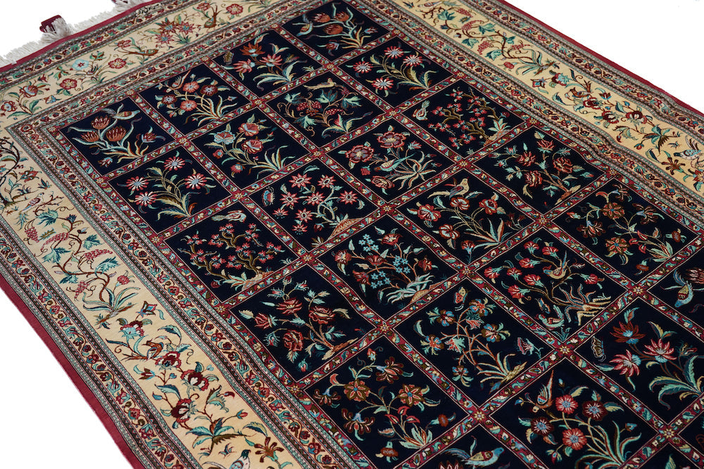 This recent, central Persian echte-city scatter shows a closely knotted silk pile in a four by seven square panel design on darkest blue, with a variety of single flowers in each panel., and some occasional tiny perching birds. Straw-cream border of vine sections, flowing leaves, flowers and perching birds. Even and professional weave. Panel/garden layout Qums are among the most popular of the genre. As new condition.