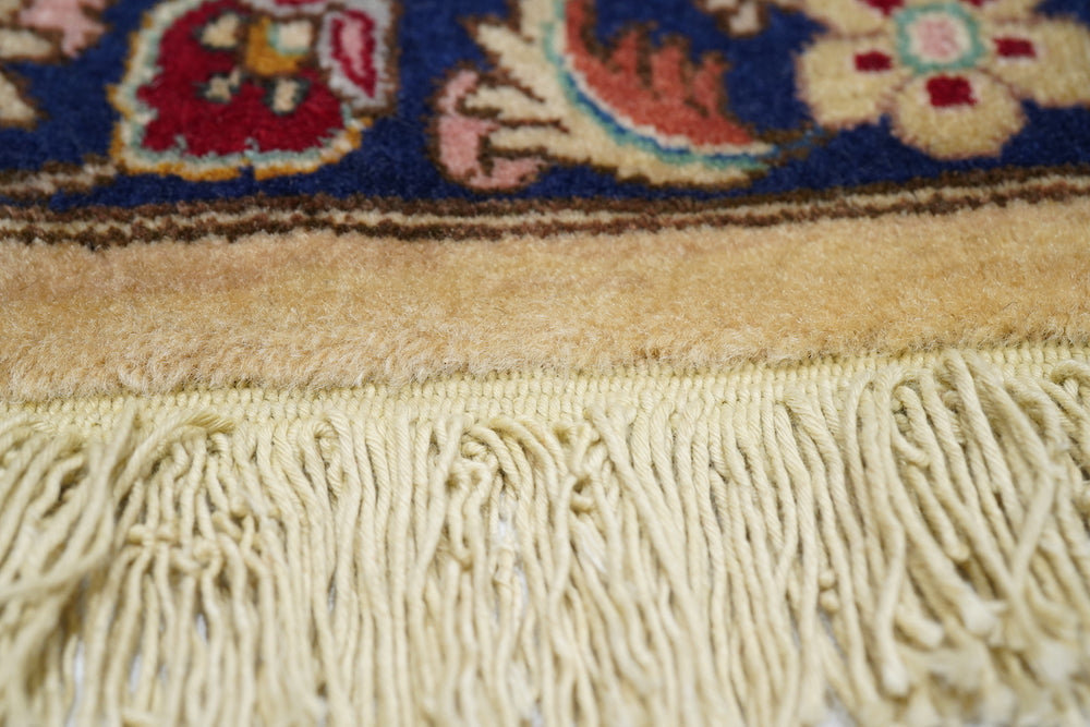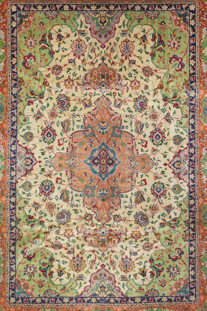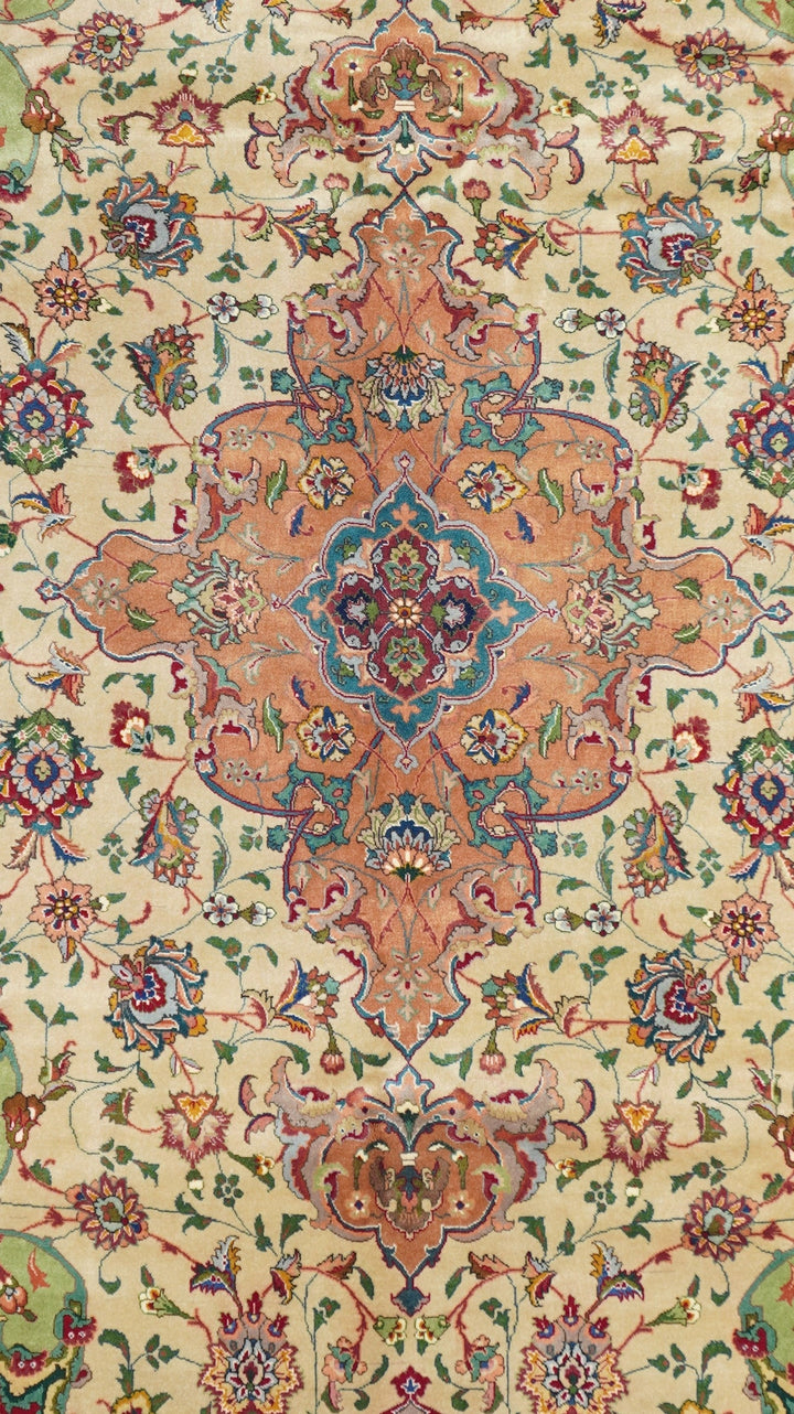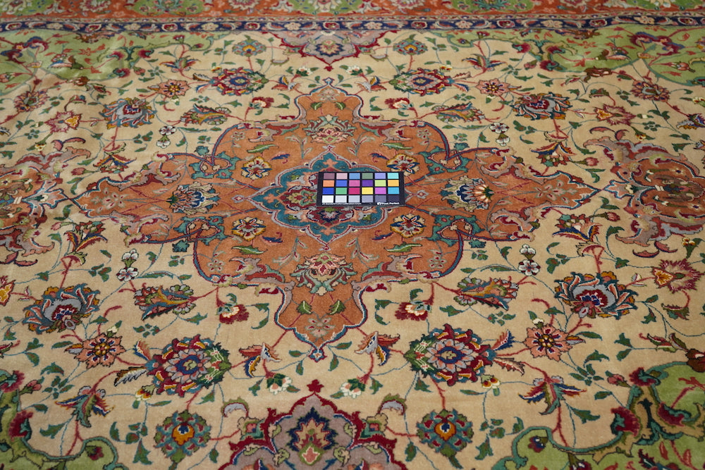 This recent Tabriz interpretation shows a creamy straw field anchored by a Vertically stretched 12 lobes rose medallion, with winged leaf pendants, straw-mustard semi-ensuite corners, and a framing bitonal main border in goldenrod and rust, with upright and tilted petal palmettes. Finely woven, short pile makes for extra legibility. As new condition.