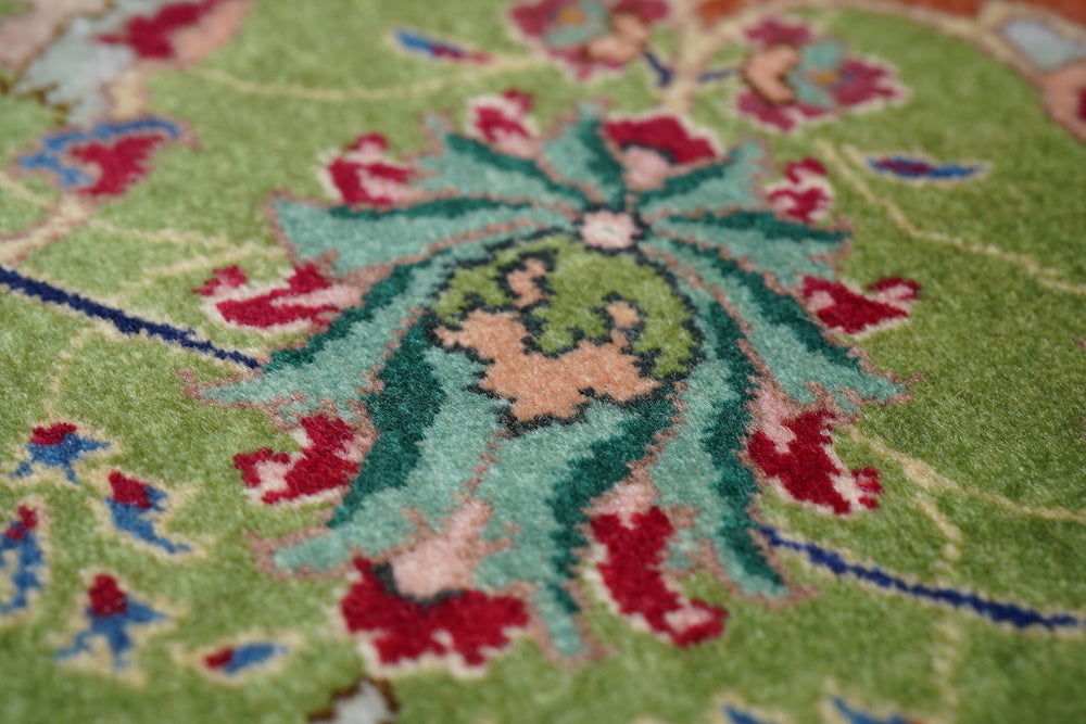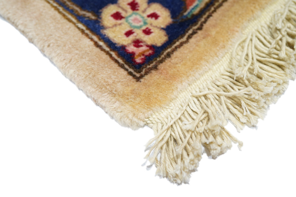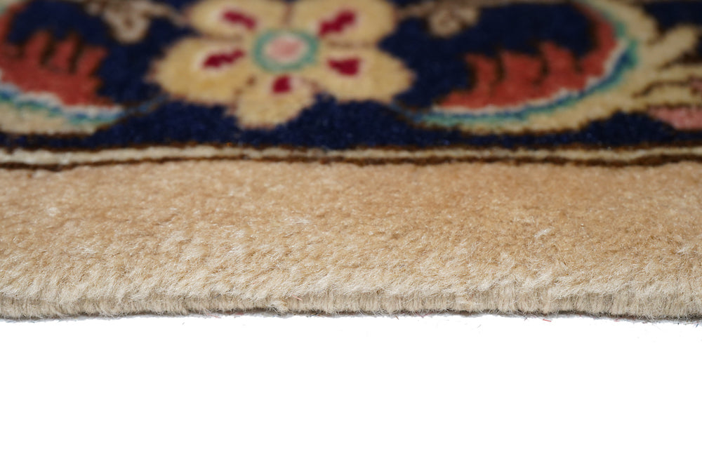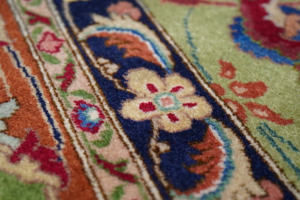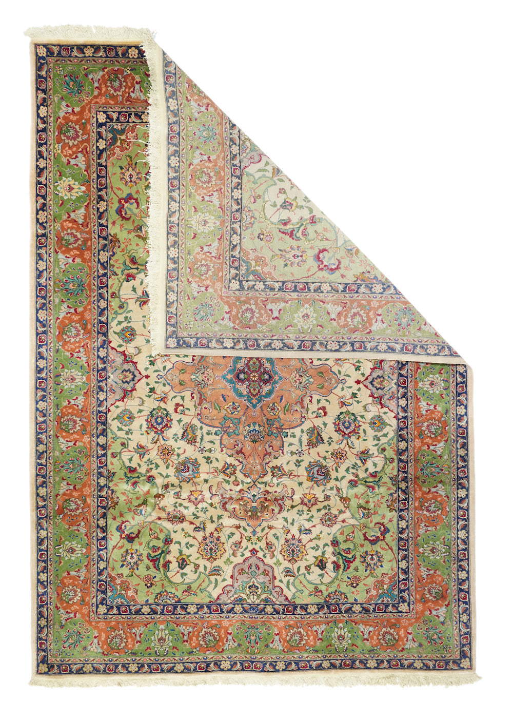This recent Tabriz interpretation shows a creamy straw field anchored by a Vertically stretched 12 lobes rose medallion, with winged leaf pendants, straw-mustard semi-ensuite corners, and a framing bitonal main border in goldenrod and rust, with upright and tilted petal palmettes. Finely woven, short pile makes for extra legibility. As new condition.