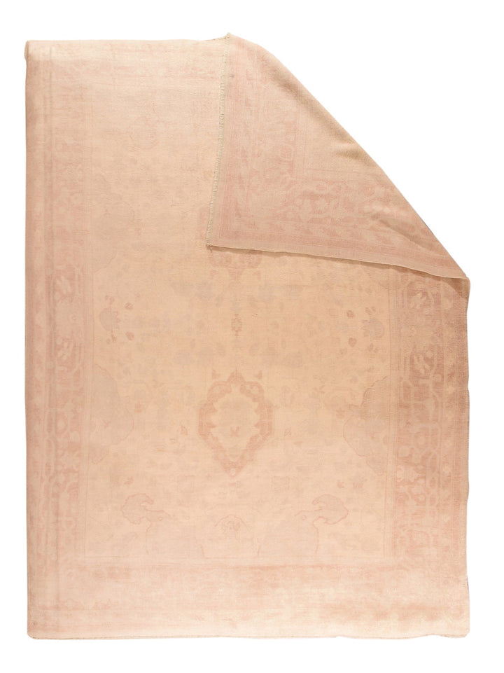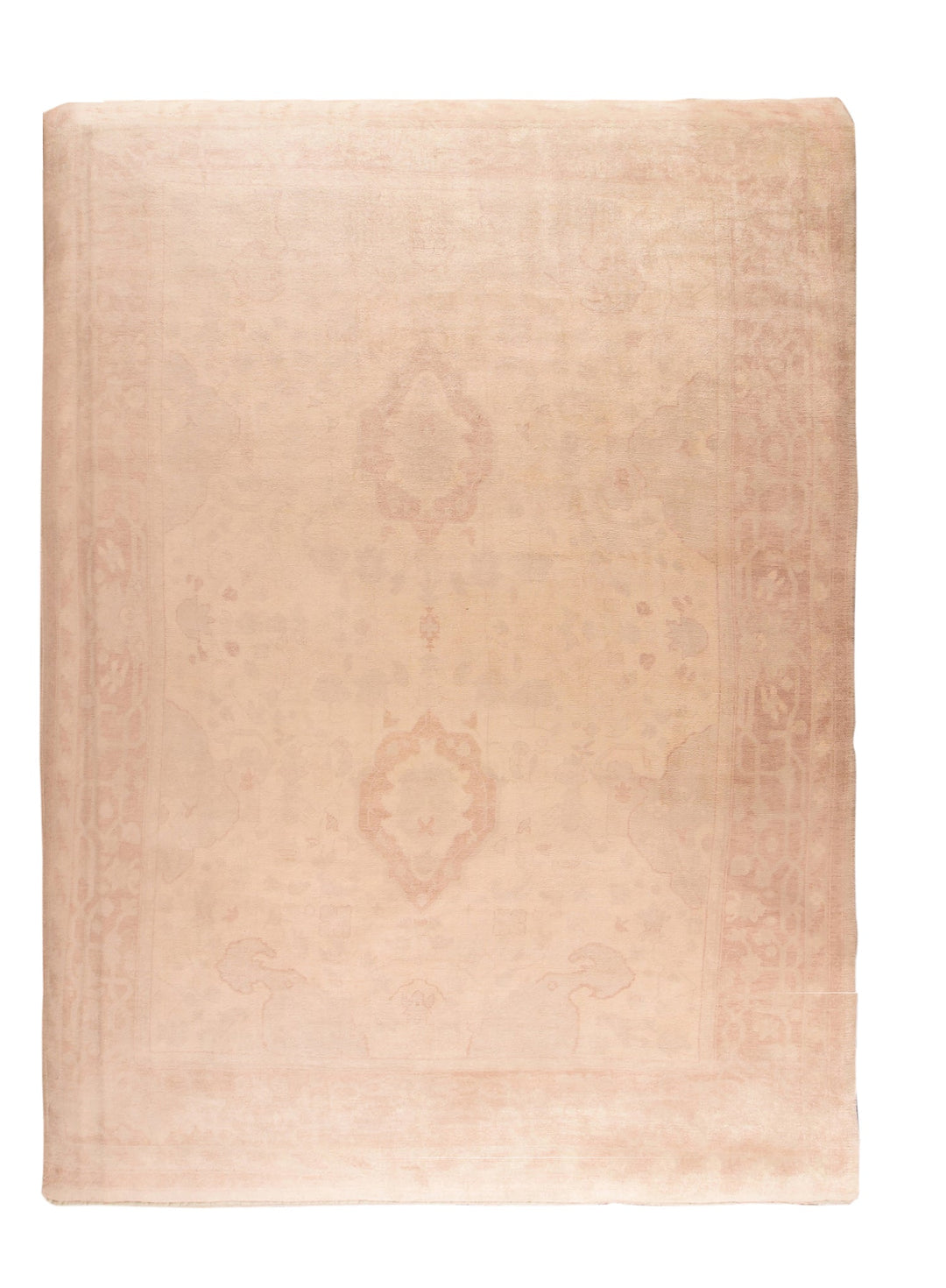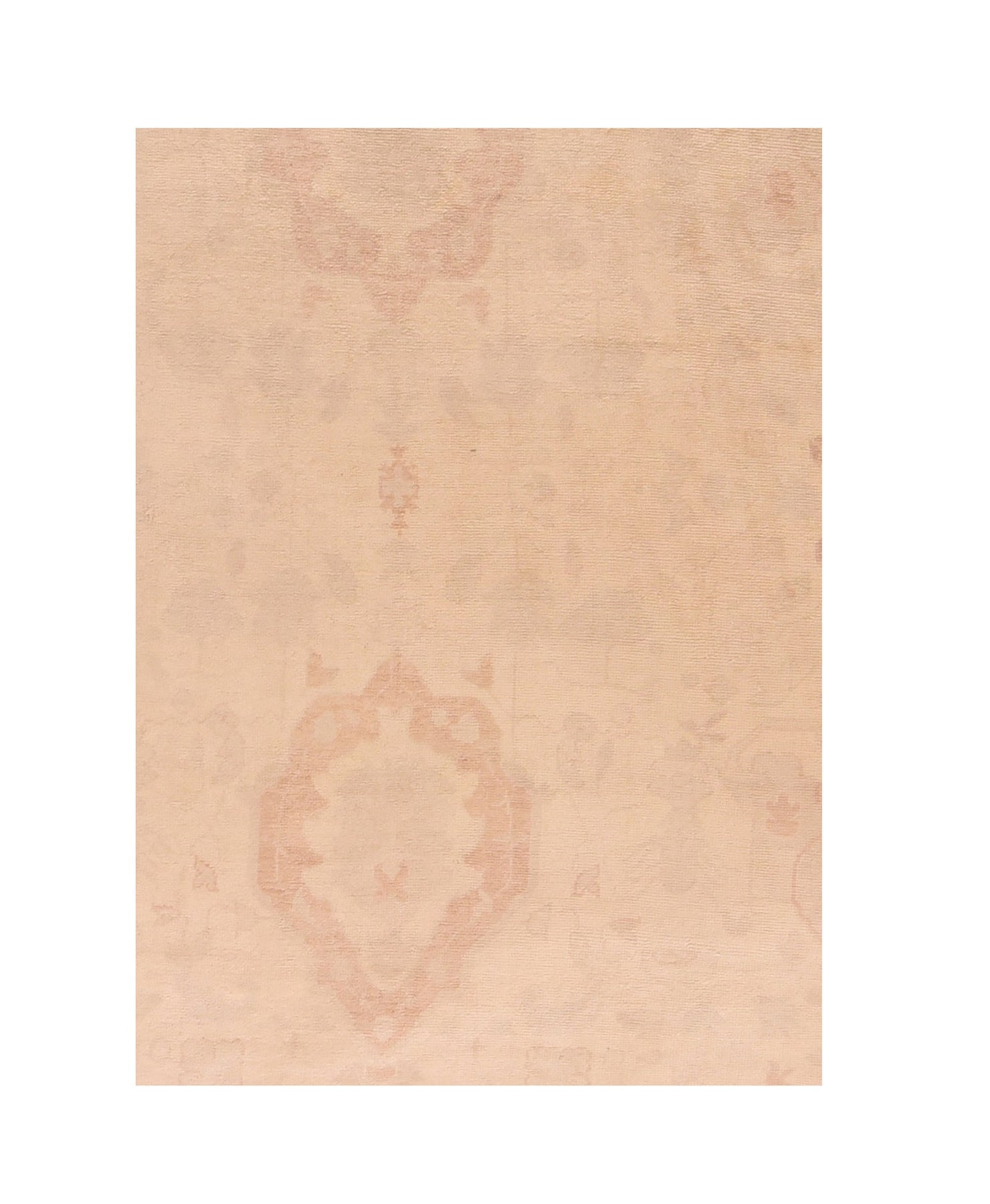 The main pattern event of this coarsely woven, western Anatolian carpet with a light field and reduced overall palette is the pair of giant burnt salmon/pale rust oval palmettes on the sand field. Large half-palmettes issue from the sides. Good condition. Wool warp.