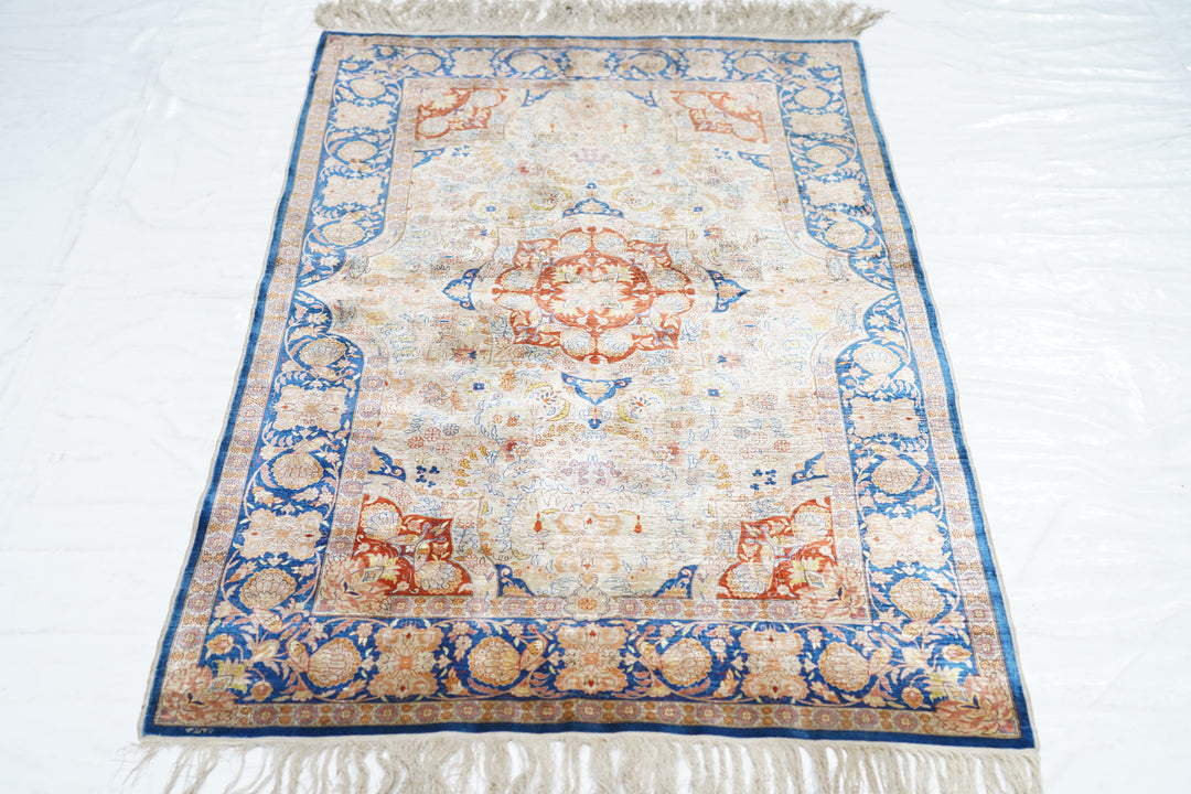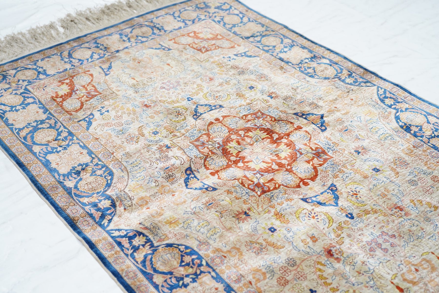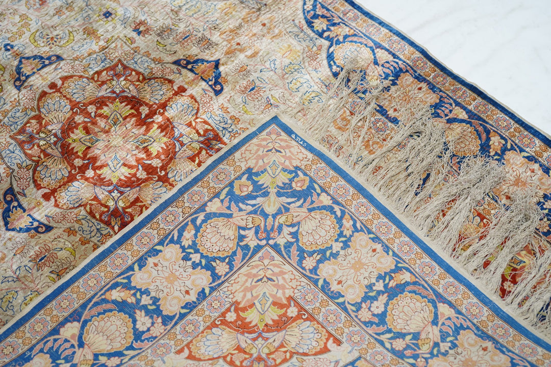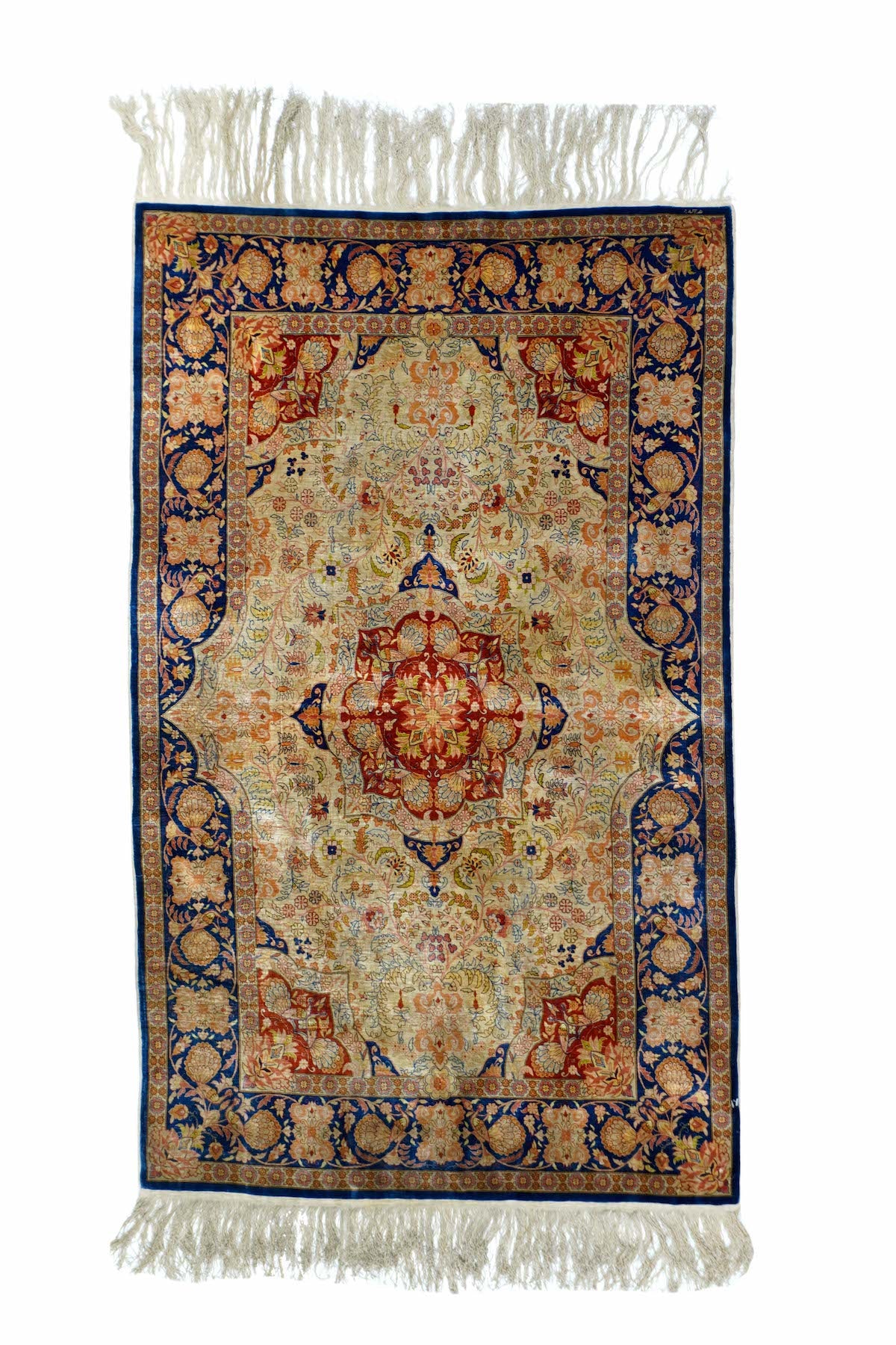 This extremely finely and evenly knotted NW Anatolian silk shows a straw-cream ground supporting a red, blue and ecru four pendant medallion enclosing four pairs of elaborate carnations. Flowering vine sprays decorate the field. Field penetrates the side borders. Dark royal blue main border with carnations, cartouches and barbed saz leaves. Ecru minors with rosettes. Signed in metal thread. As new condition with a silk warp.