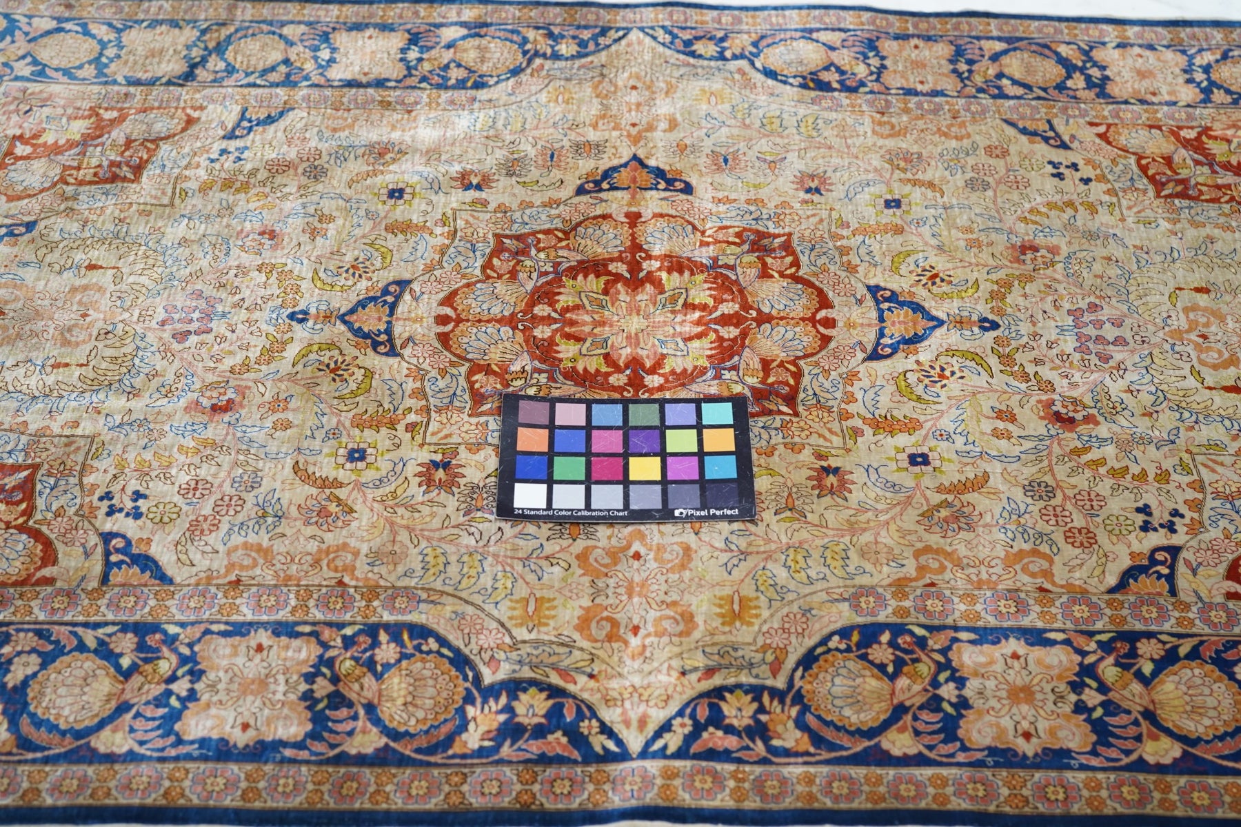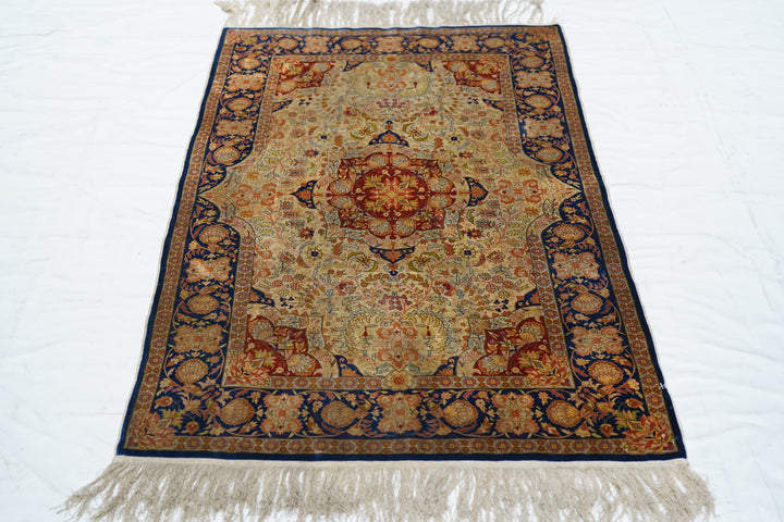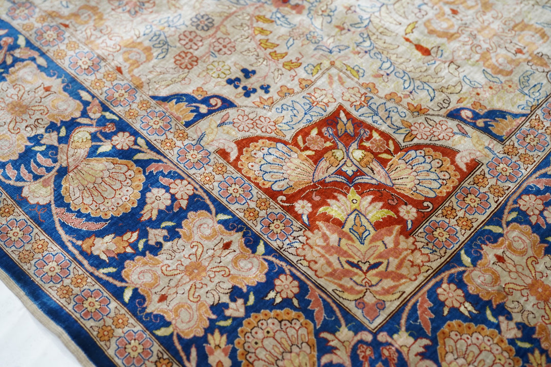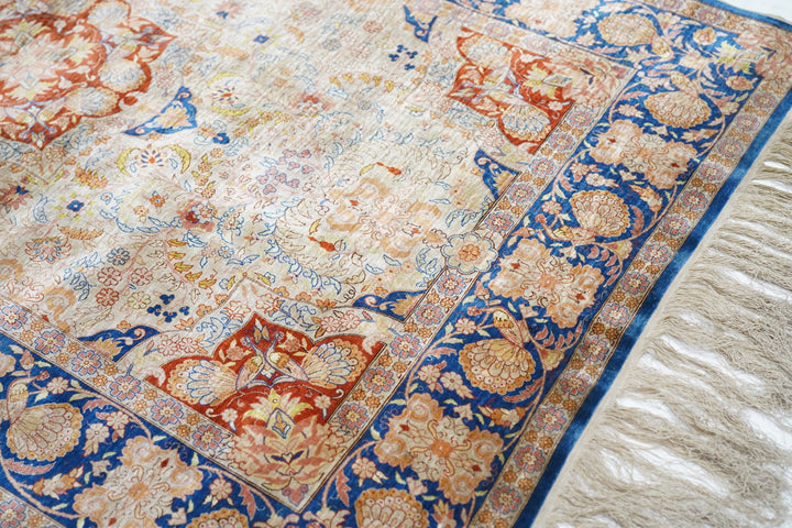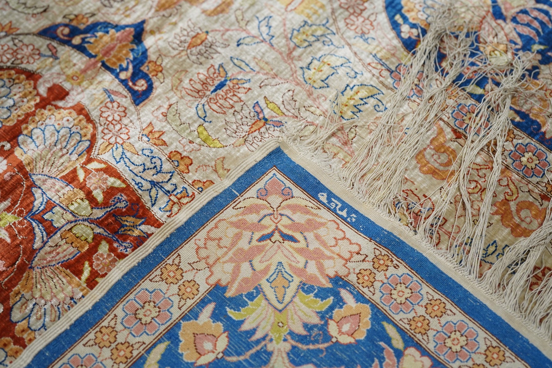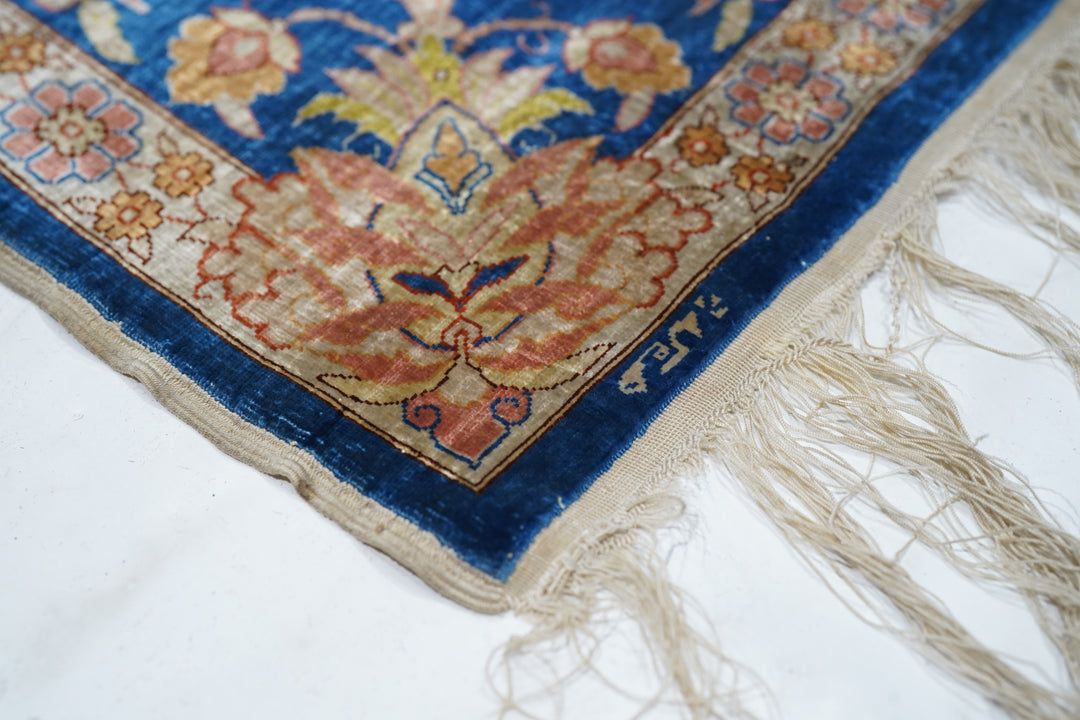 This extremely finely and evenly knotted NW Anatolian silk shows a straw-cream ground supporting a red, blue and ecru four pendant medallion enclosing four pairs of elaborate carnations. Flowering vine sprays decorate the field. Field penetrates the side borders. Dark royal blue main border with carnations, cartouches and barbed saz leaves. Ecru minors with rosettes. Signed in metal thread. As new condition with a silk warp.