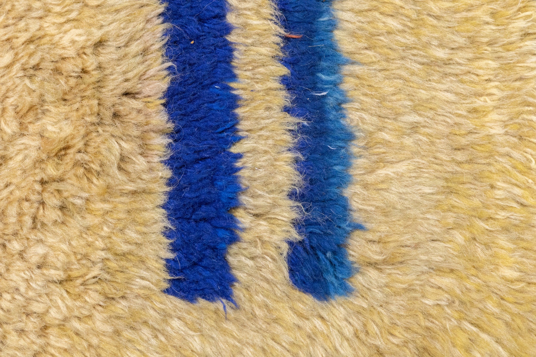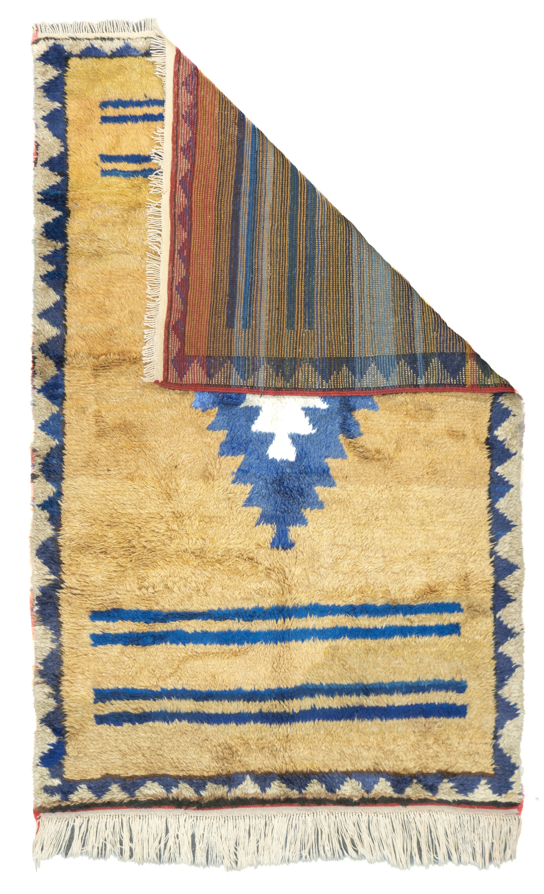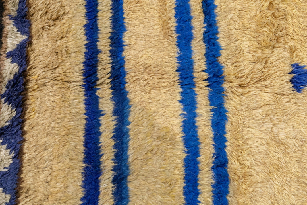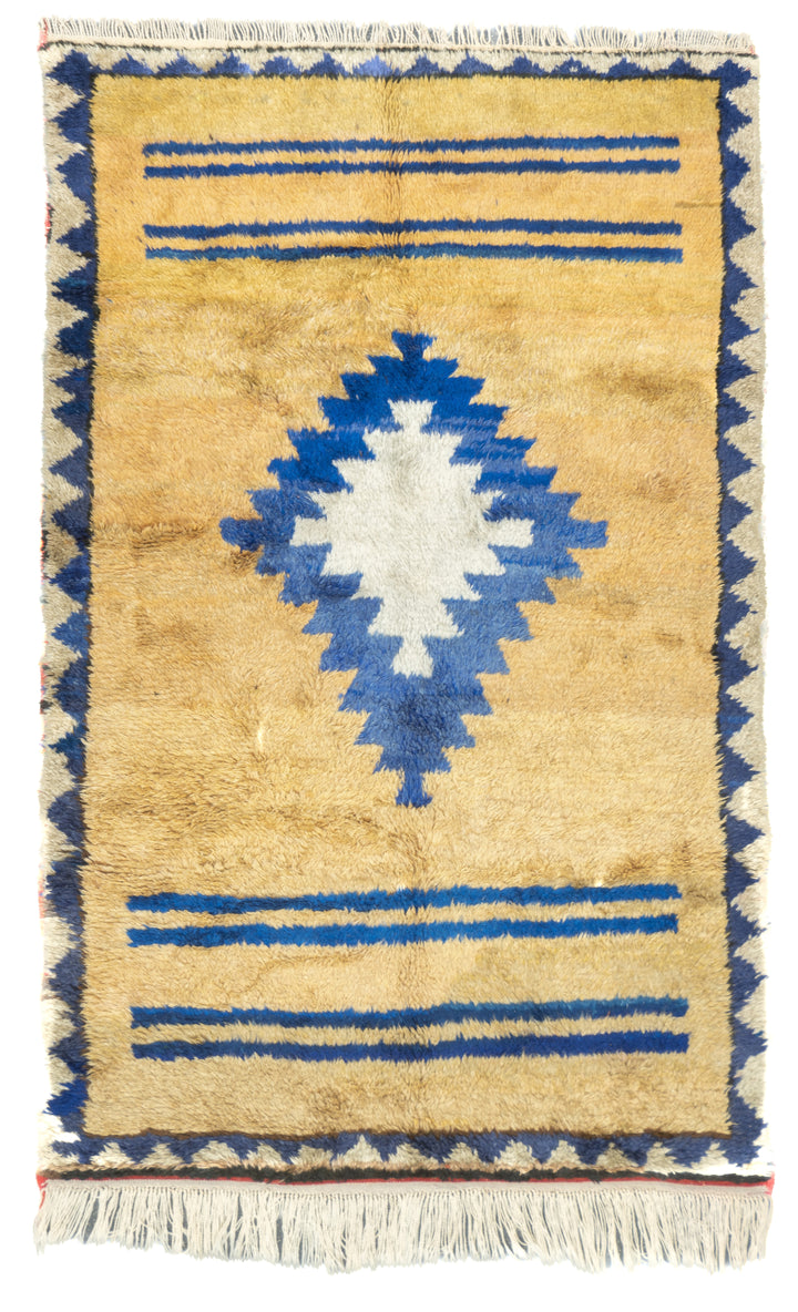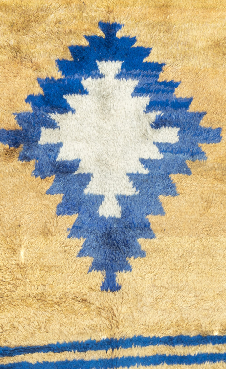 A boldly simple, tri-tone Moroccanesque scatter with a straw field and layered cerulean and cream ashik medallion. Two pairs of blue lines above and below. Ivory and blue triangle border. Coare weave. Long pile. Good condition.