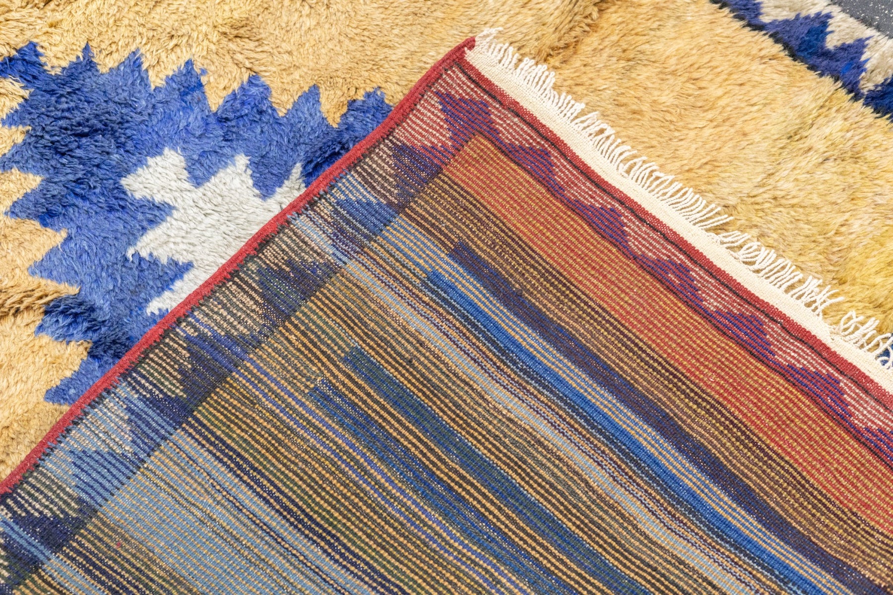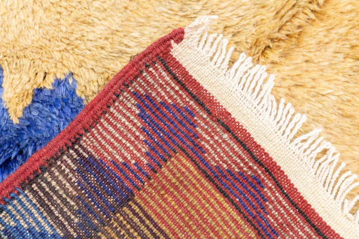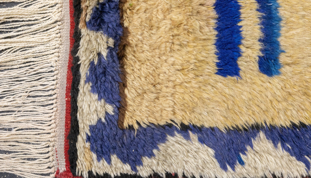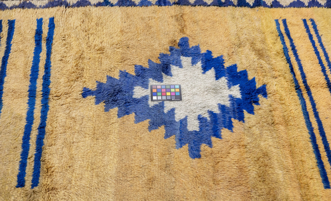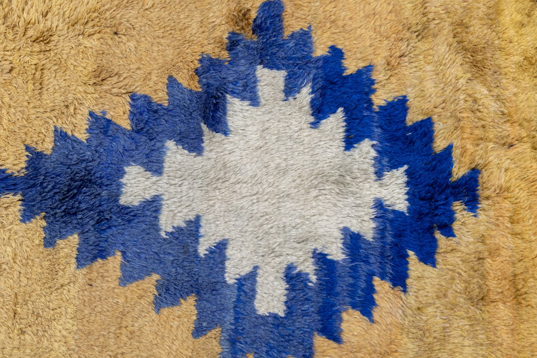 A boldly simple, tri-tone Moroccanesque scatter with a straw field and layered cerulean and cream ashik medallion. Two pairs of blue lines above and below. Ivory and blue triangle border. Coare weave. Long pile. Good condition.