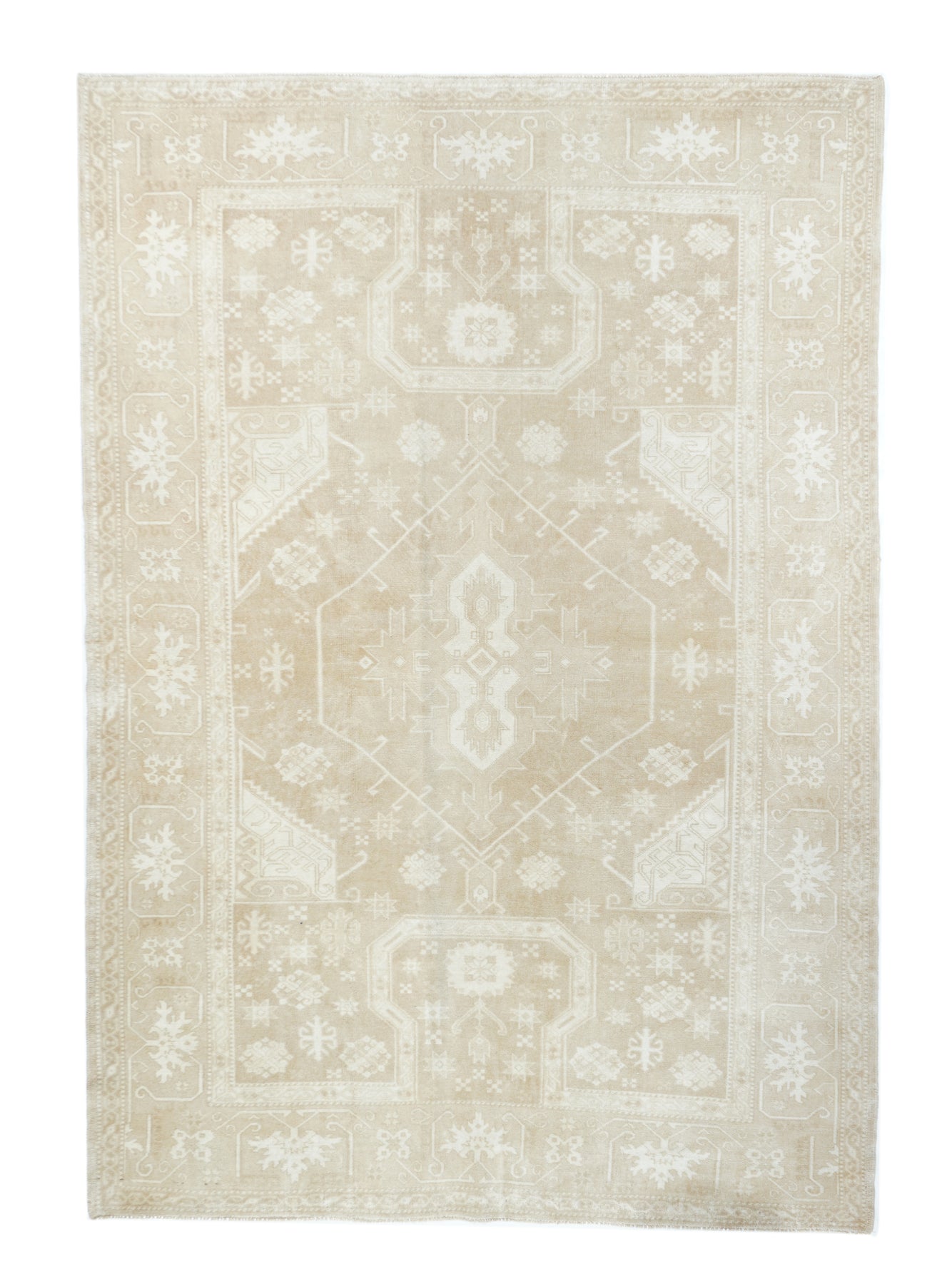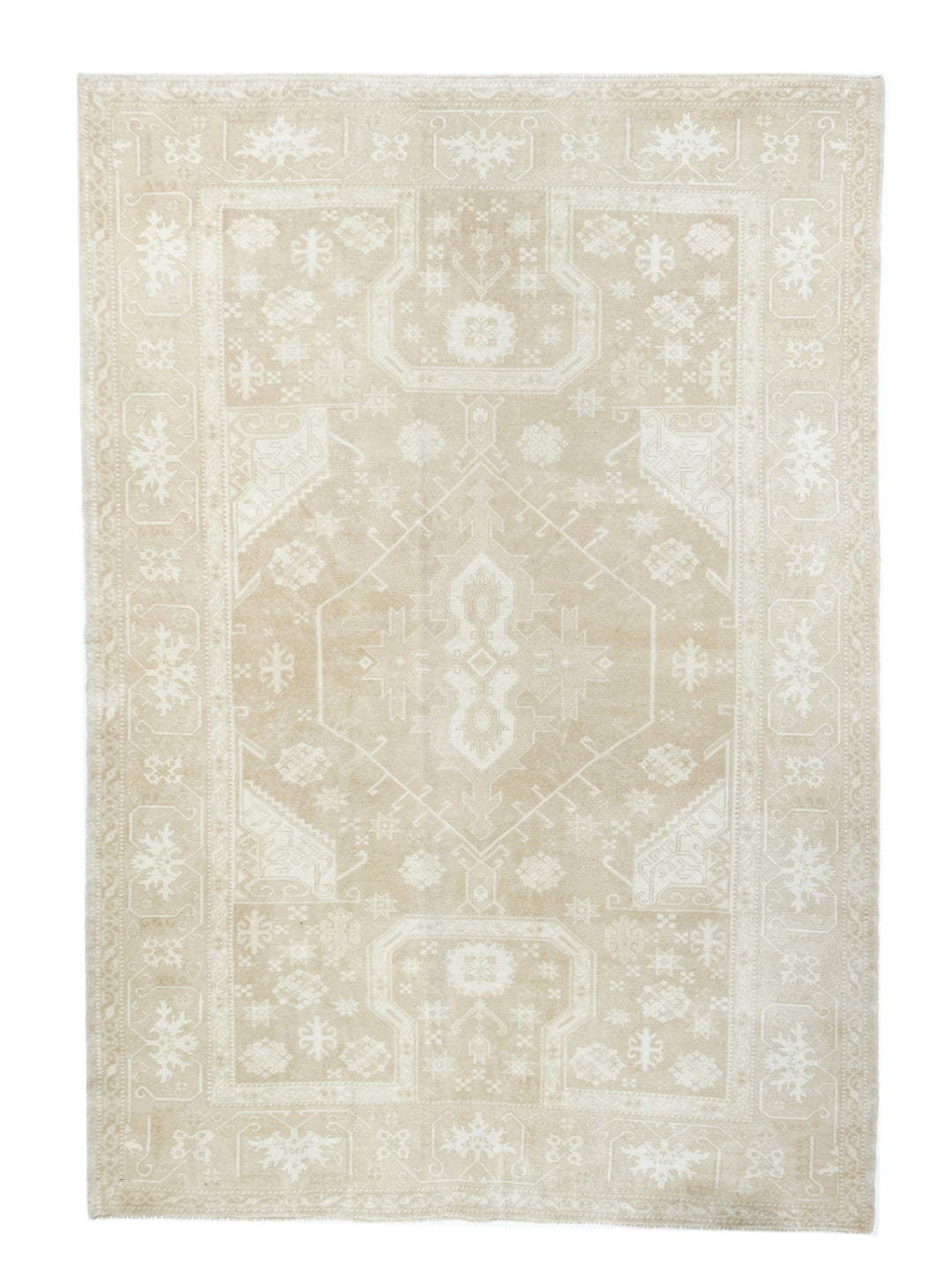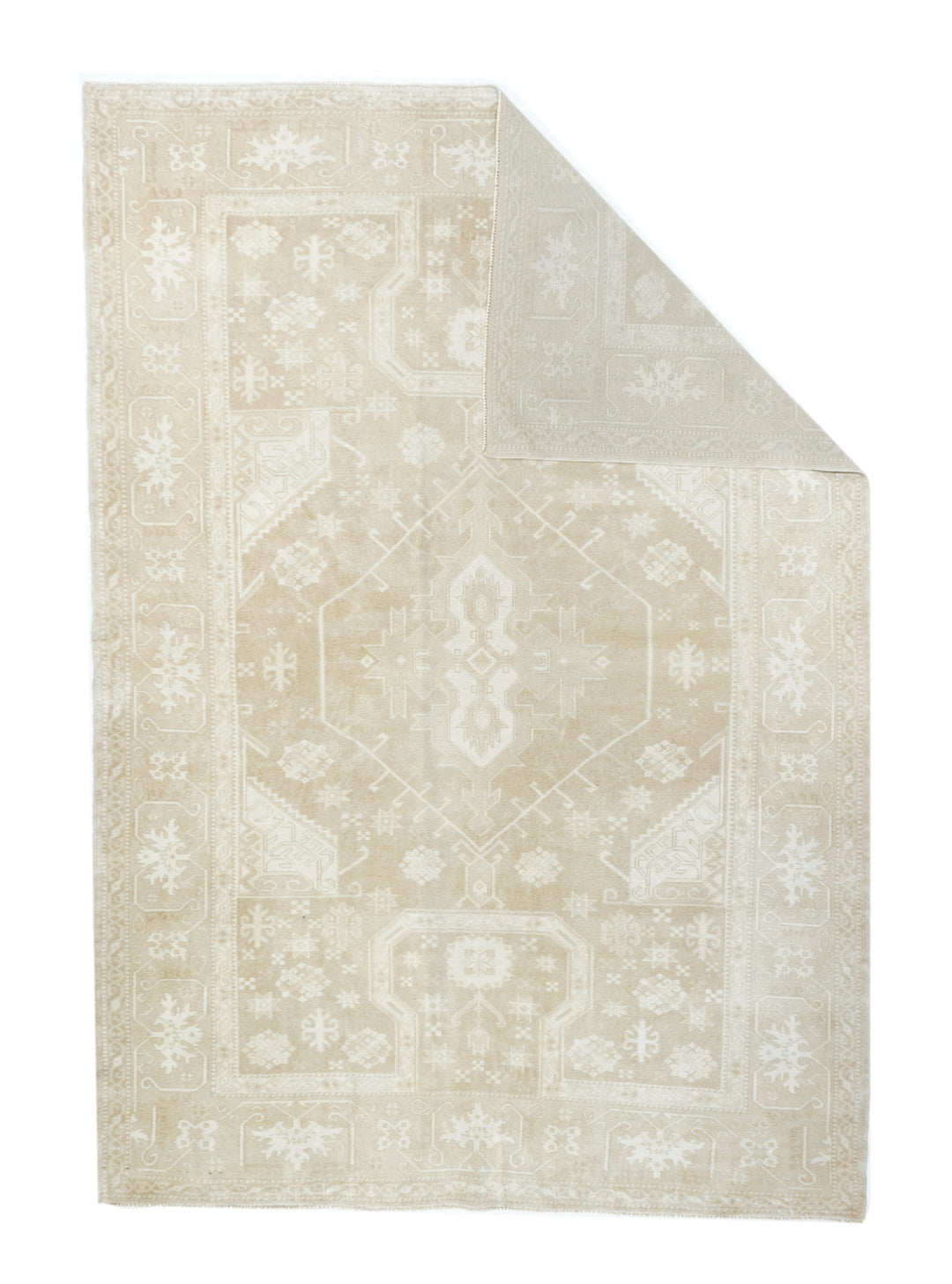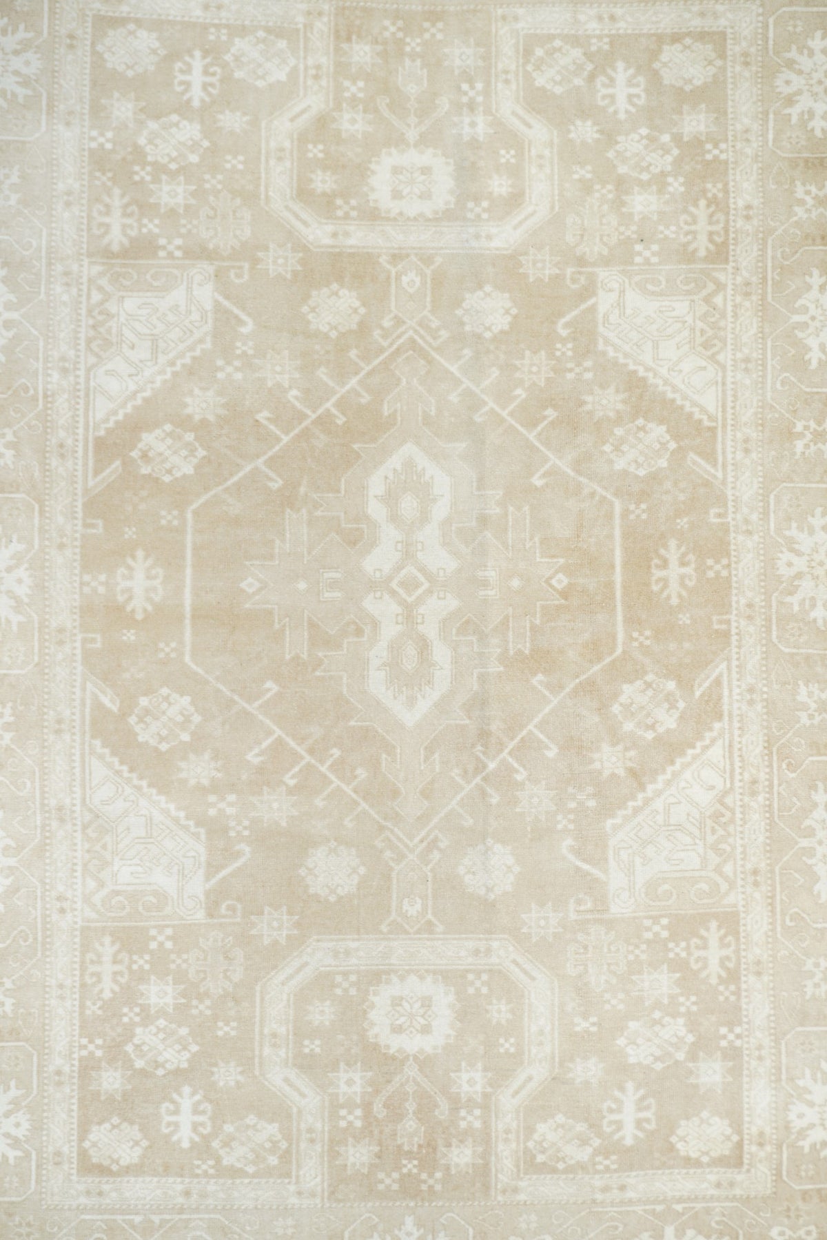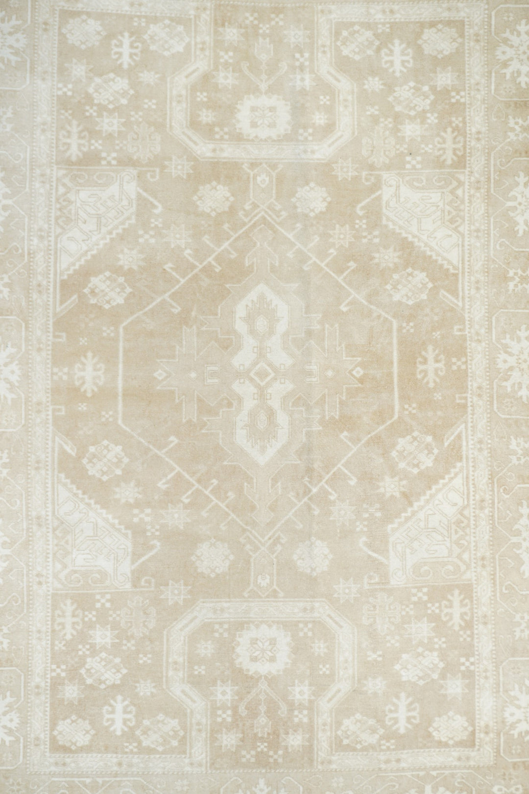 This Vintage Anatolian scatter shows cloud band-shaped “re-entrants” at the ends of the field in the 16th-17th century manner, with a central, sparsely hooked hexagon, and fractional similar side fillers, on a salmon-tan ground. Reversing ragged lotus leaf border. Subdued palette. Moderate weave. Good condition.