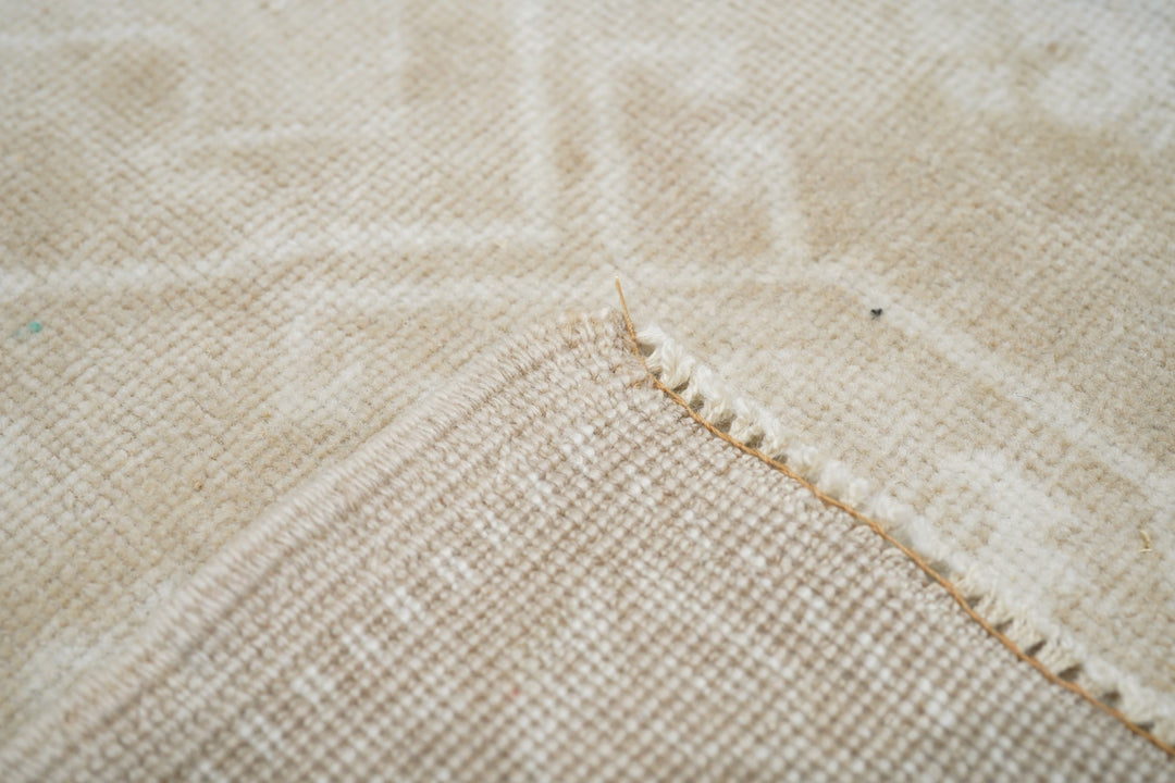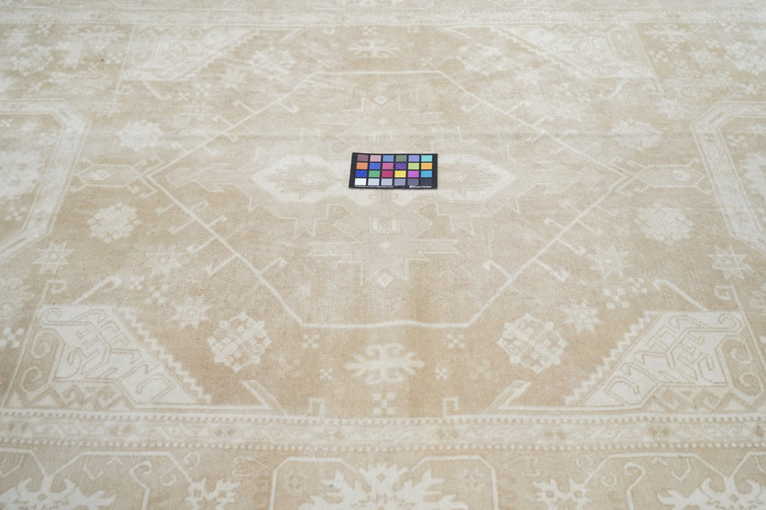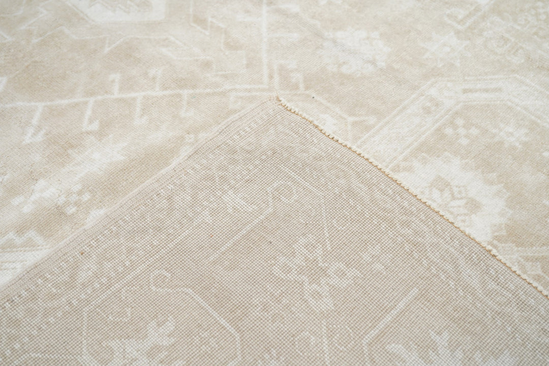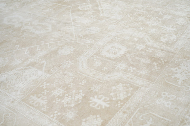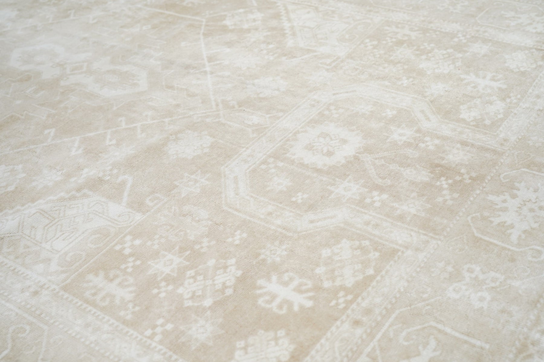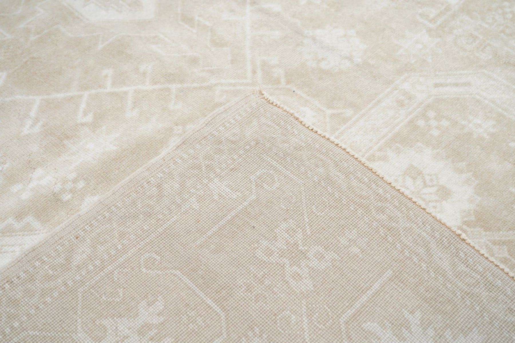 This Vintage Anatolian scatter shows cloud band-shaped “re-entrants” at the ends of the field in the 16th-17th century manner, with a central, sparsely hooked hexagon, and fractional similar side fillers, on a salmon-tan ground. Reversing ragged lotus leaf border. Subdued palette. Moderate weave. Good condition.